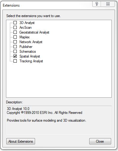 ArcGIS's raster manipulation tools are bundled with its Spatial Analyst extension. It's a big bundle so lets open ArcGIS's help system first to find out more about the tools. Open the ArcGIS help page by clicking Help > ArcGIS Desktop help from the menu bar. Click the search tab and type "Spatial analyst overview ". During the exercise, you'll find these online help pages helpful in clarifying the choices and reasoning behind a number of the steps that we will explore. Be sure, at some point, to take a look at the Overview section. (You can also open ArcGIS Help directly from the Windows operating system via: Start / All Programs / ArcGIS / ArcGIS-Desktop-Help / ArcGIS-Desktop-10-Help.)The Spatial Analyst module is an extension, so it must be loaded into ArcGIS separately.