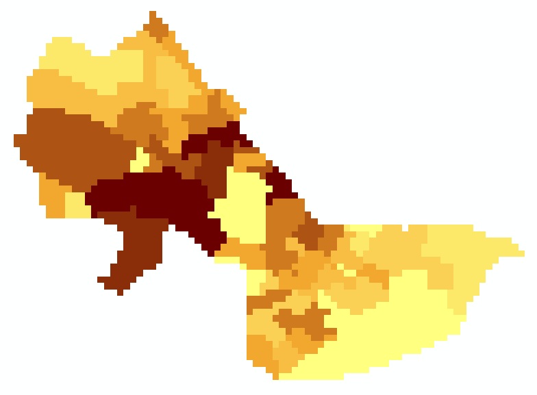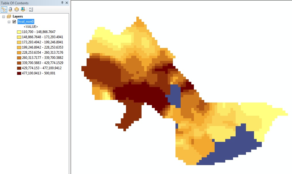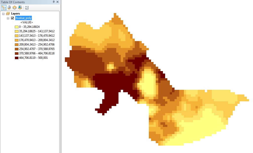 Many other variations on these interpolations are possible. For example, we know that med_hvalue is zero for several block groups--presumably those around Harvard Square and MIT where campus and commercial/industrial activities results in no households residing in the block group. Perhaps we should exclude these cells from our interpolations--not only to keep the 'zero' value cells from being displayed, but also to keep them from being included in the neighborhood statistics averages. Copy and paste the cambbgrp.shp layer into the same Data Frame and use the query tools in the Layer Properties > Definition Query tab to exclude all block groups with med_hvalue = 0 (which means include all block groups with med_hvalue > 0). Now, recompute the polygon-based interpolation (Hint: the major difference between the first and second approaches of interpolating housing values is that the former one is centroid-based, and the latter one is polygon-based) and call this grid layer 'hvalue_non0'. Select the same color scheme as before. In the data window, turn off all layers except the original camborder layer (displayed in a non-grayscale color like blue) and the new hvalue_non0 layer that you just computed. The resulting view window should look something like