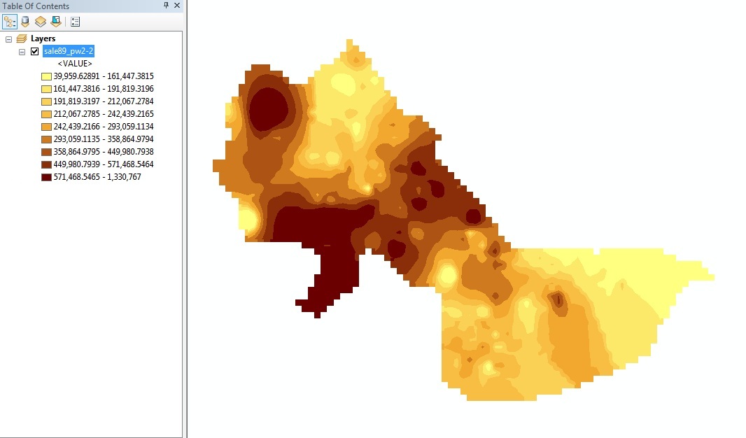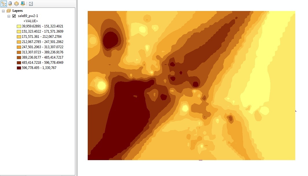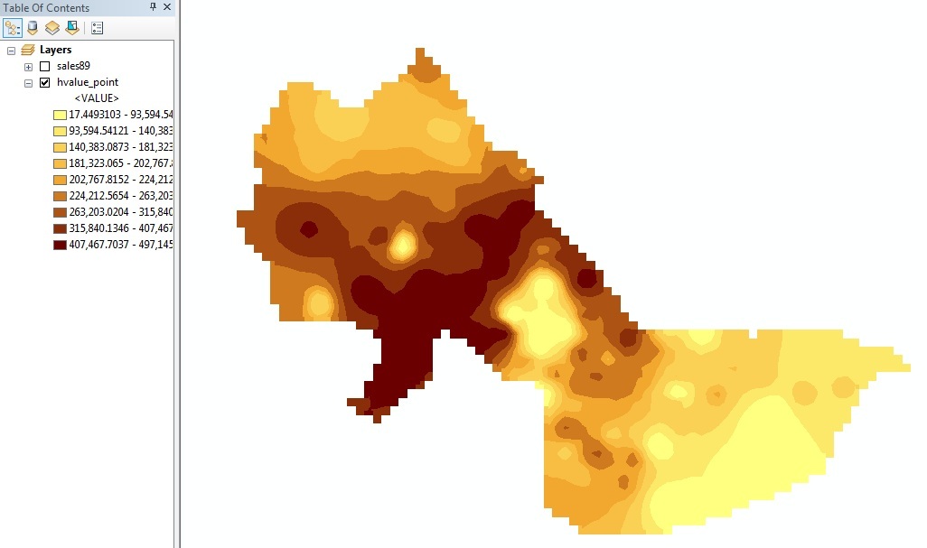 Note: None of these interpolation methods is 'correct'. Each is plausible based on a heuristic algorithm that estimates the housing value at any particular point to be one or another function of 'nearby' sales prices. The general method of interpolating unobserved values based on location is called 'kriging' and the field of spatial statistics studies how best to do the interpolation (depending upon explicit underlying models of spatial variation). Recent versions of ArcGIS offer an optional 'GeoStatistical Analyst' extension that includes several tools for kriging and exploratory spatial data analysis. (Check out the ArcGIS help files.) For further discussion of kriging methods and spatial statistics, you may also be interested in S+ Spatial Stats: User's Manual for Windows and Unix, by Kaluzny, Bega, Cardoso, and Shelly, MathSoft, Inc., 1998 (ISBN: 0-387-98226-4). 'Spatial Statistics' is an add-on to a high-powered statistical package called S+ that is available on Athena.