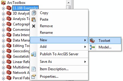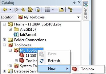 To Create a New ModelBuilder Model, first create a "Toolbox" to contain it. In the Catalog window, right-click the "My Toolboxes", and then click New> Toolbox, named as '11.188 Lab 7'.