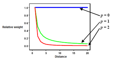 As indicated above, weights are proportional to the inverse of the distance (between the data point and the prediction location) raised to the power value p. If p = 0, there is no decrease with distance, and the prediction will be the means of all the data values in the search neighborhood. If p value is very high, only the immediate surrounding points will influence the prediction (from Arcgis Desktop Help webpage).