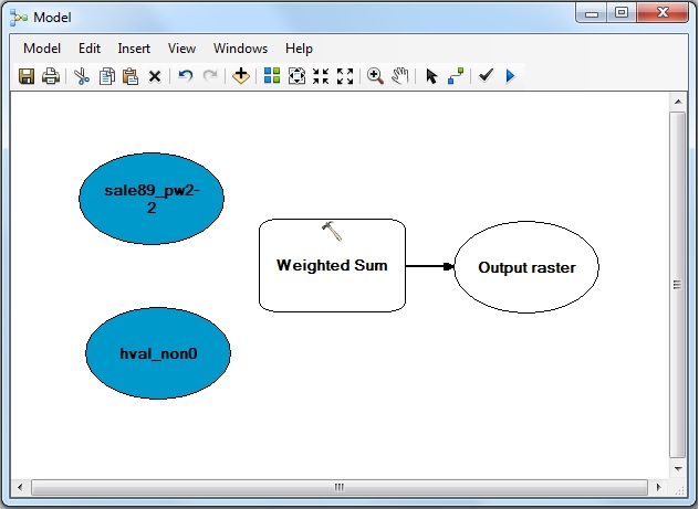 Try to create a weighted overlay in which the hvalue_non0 is weighted at 70% influence, and the sales89_pw2-2 layer interpolated from the sales_89 point has a 30% influence. When the census-derived data is 0, you want the weighted overlay tool to fill in with sales_89 estimates. Getting the weights to be handled correctly for grid cells that are missing in one of the layers can be tricky and may require adding additional steps to the model. Also, using map algebra to combine raster layers can get tricky when you need to rescale grid values or convert them to integer values before doing the map algebra that you want. (ArcMap provides additional Math functions to help in this regard. See, for example, the Int() function to convert floating point grid cell values to integers.) For this exercise, you do not need to turn in any results from your use of Model Builder. However, we will make further use of Model Builder in Homework Set #3.