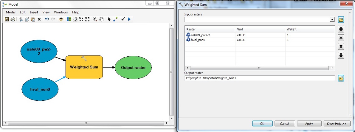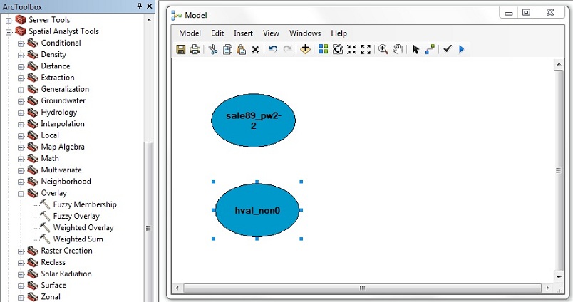 You should then be able to drag and drop your two grids (called sale89_pw2-2 and havl_non0 in the figure below) from the main map with "Table of Contents" into the Model diagram window. You can also select layers to add from disk using the standard ArcGIS "yellow Plus" icon.