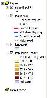 Open the layer properties for Sales89. Using "Realprice" as your "Classification Field," try out the "Legend Types" "Graduated Color" and "Graduated Symbol." Also try the classification schemes "natural breaks," "quantile," and "equal interval." Remember the question we were interested in? Have these exploratory symbolization exercises shown you the relationship between sale price and land use? It's very difficult to see any type of pattern with so many data points, especially in a place like Cambridge, where high and low income neighborhoods are so close together. We'll now abandon the automatic classification settings and use some of our expertise to determine the classes. We'll look only at very high-priced properties and very low-priced properties. Change the number of classes to "3" in the layer properties - Symbology tab and click Classify button. Change the first number shown in "Break Values" from something like 474099 to 100000 and second number to 1000000. Now you have three categories, less than 100000, more than 1000000, and in between. Click O.K. and Change the color and size of second category (realprice from 100000 to 1000000), so that two extreme values, lower than 100000 and higher than 1000000, stand out. Give the points bright colors that will show up on top of the land use layer. Notice that the high-priced properties are in the lowest density areas. We're on our way to making an explanatory map!