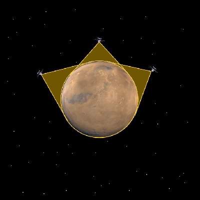 The satellite, in the middle on the picture will be the one right above the landing site and the main base. The other two will be 65 degrees to either side. All the satellites will be in geosynchronous orbit, which is roughly 1.69*107m above the surface of Mars. From this orbit, each satellite will be able to cover about 95% of its side of Mars (from 80.4 degrees South to 80.4 degrees North). The overall area being covered this way is about 60% of the planet and includes all the places our people and equipment could ever reach. For the actual data transmissions, only the two outside satellites will be used. They are positioned in such way that one of them will always be in contact with Earth. The third one will be basically used as a backup; if one of the others fail it will be able to move to the failed satellite's position and replace it. Authors: Jordan Brayanov (jordan12@mit.edu) and Artem Gleyzer (agleyzer@mit.edu) |
