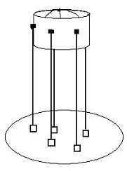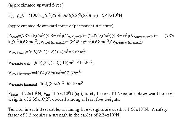 The habitat is naturally buoyant and the water within the blue hole is virtually stagnant, so it is both efficient and inexpensive to support the structure with tension cables. At least five cables, constructed of coated steel, with strength of 4.71 x 105N each, will run from reels on the side of the habitat down to weights of 4.7 x 105N each, on the sea floor. (Numbers assume 5 weights) The base of the habitat will be at a depth of 41.6m; the cables will be 160m long, extending 103.4m from the base of the habitat (extra length for initial lowering of habitat into blue hole) and run at an angle of approximately 90° to the base of the habitat.