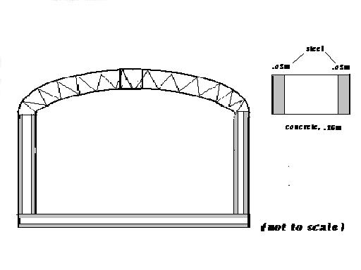 The structure is constructed primarily of steel and concrete. Steel is a non-corrosive industrial metal that stands up well to pressure and meets ASTM standards for pressure vessels. Concrete is used for weight. The walls of the cylinder and the floors of each level have an outer steel layer .02m thick and an inner layer of the same thickness, with a .16m layer of concrete between. The dome has the same three-layer structure, but within the concrete layer are steel poles positioned at angles to each other, to improve strength.