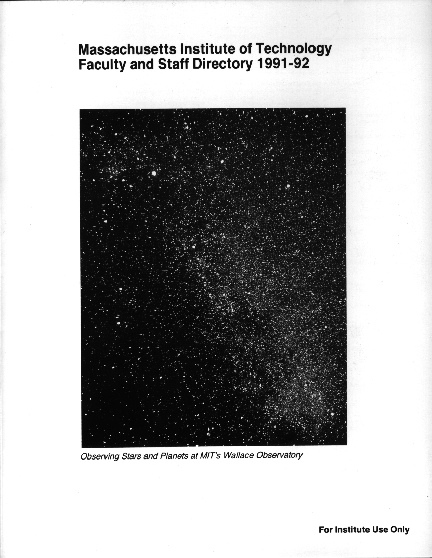 The cover photograph was taken by Joe Harrington, on December 6, 1990, at MIT's Wallace Astrophysical Observatory in Westford, Massacusetts. This was for the undergraduate seminar ``12s23 Observing Stars and Planets,'' in the Department of Earth, Atmospheric, and Planetary Sciences. To capture the night sky, the camera was mounted on a tripod for a 25-minute exposure on Kodachrome 200 film; the 28mm lens was set at f/3.5.Earth's rotation during the exposure draws the star images into trails whose colors are related to stellar temperatures. The constallation Orion (the Hunter) is rising to the right of center. The red streak to the right of the three stars of the Hunter's belt is the Orion Nebula, a region of ionized hydrogen gas in which new stars are forming. Two sloping lines that cross the star trails are the running lights of aircraft.