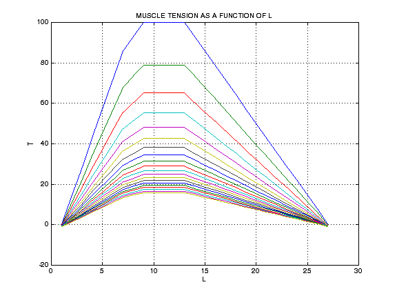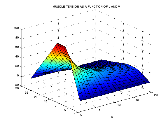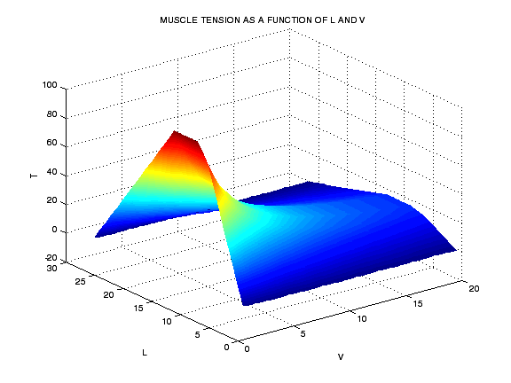 Fig. 1 Builds a three dimensional presentation of the two relations Tension-Length and Force-Velocity given in the muscle and motor control literature (Gordon et al, 1966; A. Huxley, 1957; Hill, 1938) with some corrections in the mathematical model.