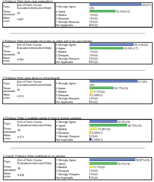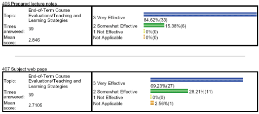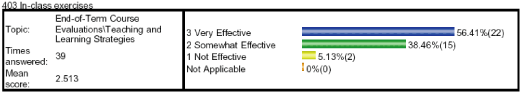 b) I used 16 concept questions over the 9 lectures with responses taken on the PRS system. The performance and answers to these were provided on the web page. I continue to find these very useful for engaging the class in the material while I am lecturing. 95% of the respondents on the SEF rated the in-class exercises as Very Effective or Somewhat Effective. Also several positive comments were made about the PRS/concept questions in the written comments from the end-of-term evaluations. In general my teaching reviews were good (see below), so I think the students found my lectures to be helpful to them.