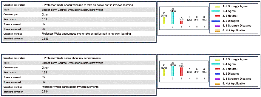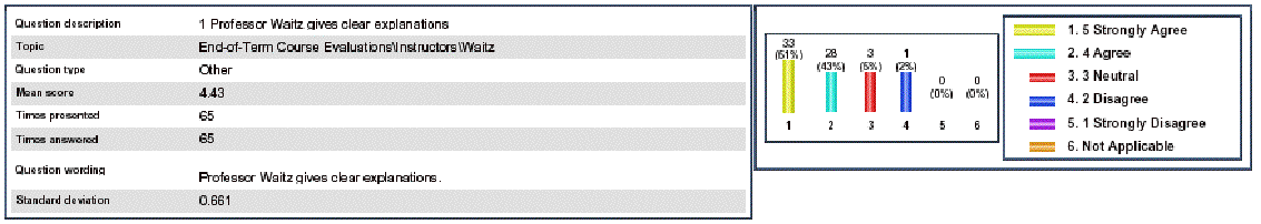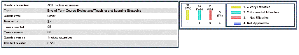 b) I used 16 concept questions over the 9 lectures with responses taken on the PRS system. The performance and answers to these were provided on the web page. I continue to find these very useful for engaging the class in the material while I am lecturing. 97% of the respondents on the SEF rated the in-class exercises as Very Effective or Somewhat Effective. Also several positive comments were made about the PRS/concept questions in the written comments from the end-of-term evaluations. In general my teaching reviews were good (see below), so I think the students found my lectures to be helpful to them.