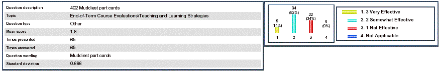 The use of the PRS system in-class and the collection of, and response to, the mud cards gave me a large amount of data on the class performance (formative and summative). Also, as in the past in Unified, we collected data on time spent on various activities (its primary use is to make sure the class stays within bounds).