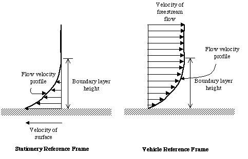 PROCESS 2: For the flow very close to the body (within an inch or so of the surface for a large airplane), the body adds energy to the flow. That is it pulls it along with it. We discussed this in lecture T1 and in a PRS question. Some number of molecules very close to the surface of the body stick to the body. They in turn pull on the particles next to them. This is exactly the same mechanism by which honey sticks to a spoon. The more viscous the fluid, the stickier it is and the more molecules get pulled along with the body (compare how much honey sticks to a spoon--to how much water sticks to a spoon--to how much air sticks to a spoon). What develops is something called a boundary layer. So the velocity very near the surface of the body looks like the sketch shown below. The thickness of the boundary layer depends on how viscous the fluid is, on how fast the body is moving, and on the distance from the leading edge of the body. The boundary layer is thicker the more viscous the fluid is, thinner the faster the body is moving, and thicker the longer the distance from the leading edge. By dimensional analysis you can see that the thickness of the boundary layer is proportional to sqrt(nx/c) where n is the kinematic viscosity (units=m^2/s), x is the distance from the leading edge of the body and c is the speed of the body. So to cause the flow to stagnate on a body (move at the same speed as the body) kinetic energy must be added, thus raising the total energy of the flow.