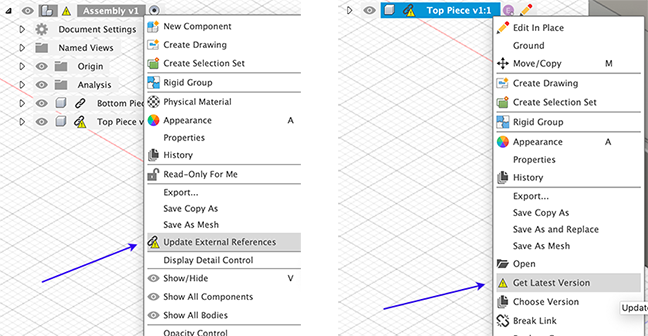 ). Right-click on the assembly and select Update External References to update the entire assembly, or you may right-click on an individual part and select Get Latest Version to update only that part. Do one of these to bring your recently saved changes into the assembly.