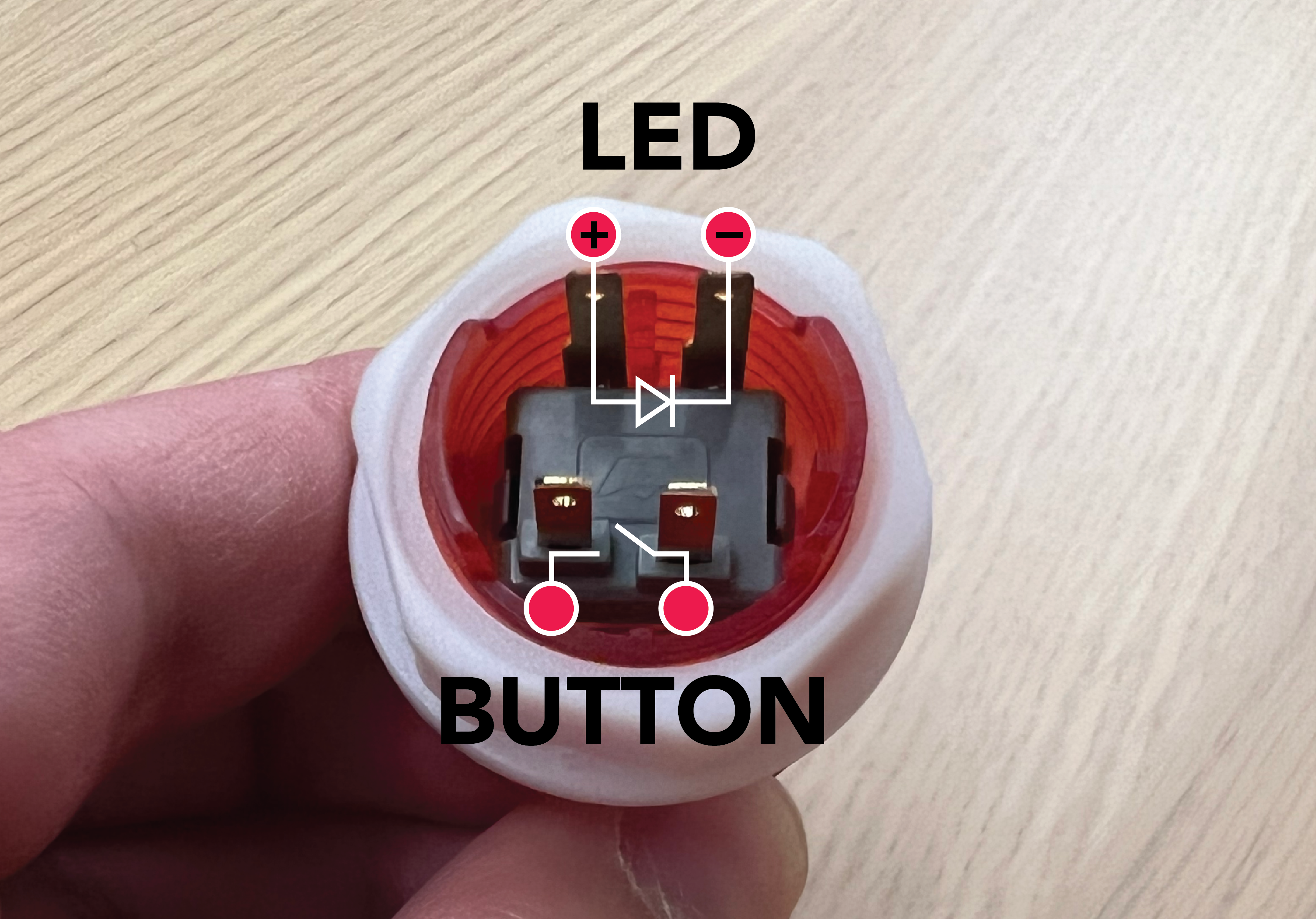 To figure out which wire goes in positive, take a look at the LED Connections on the PCB, which is labeled as + then - from left to right. The connector will only fit in one direction. Note that the polarity matters for the LEDs, but not for the buttons.