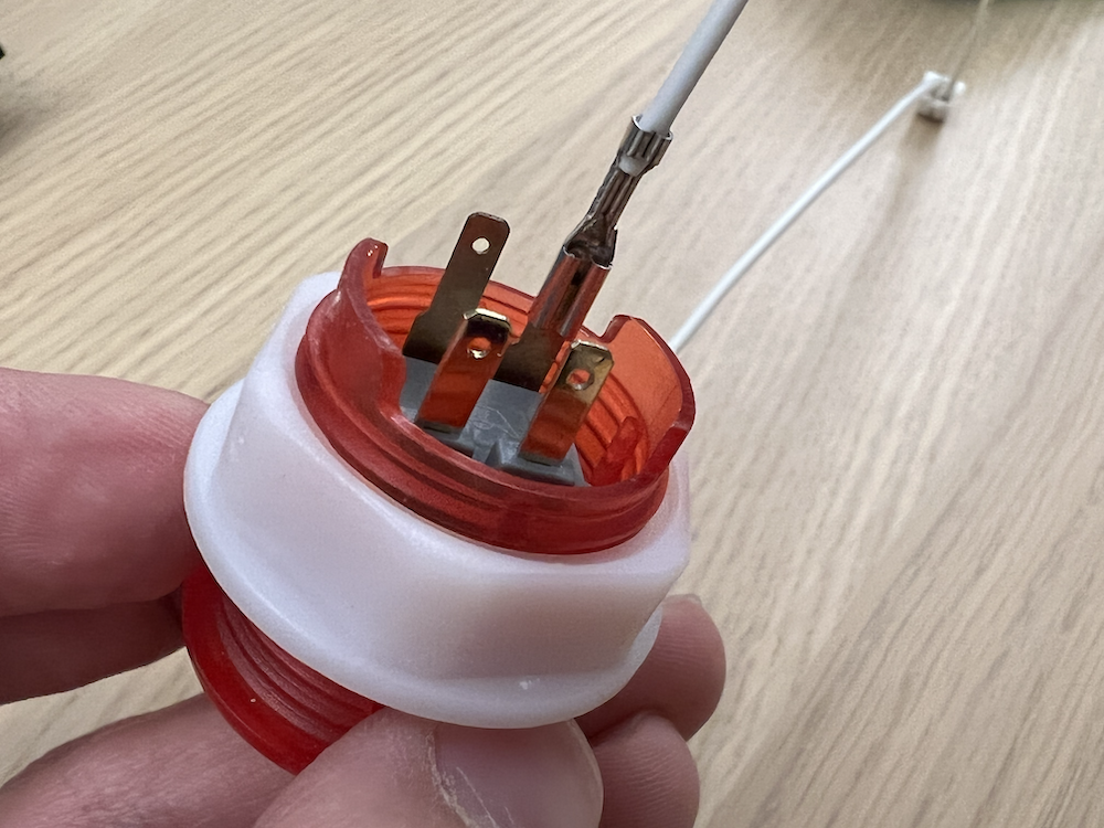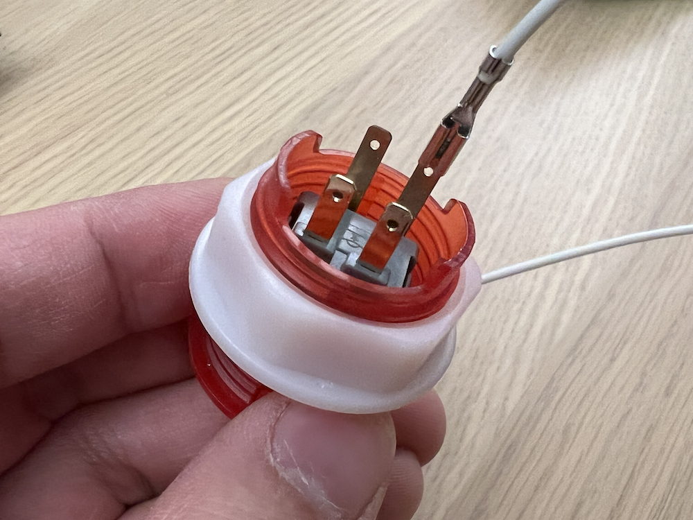 Each button has 4 contacts - 2 for the button contacts, and 2 for the LEDs. For these, you'll be using the cables that have the spade connectors on one end, and the 2-pin JST XH connectors on the other. Wire these up as shown: