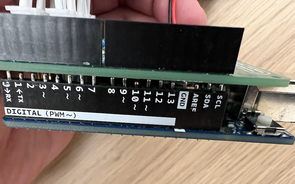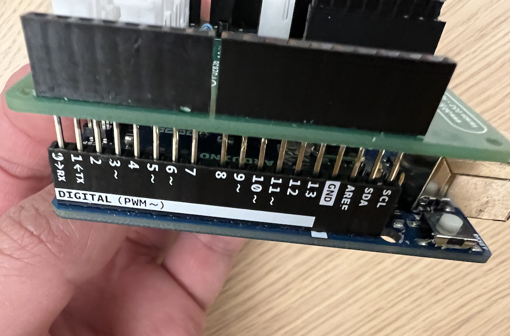 Take a note at how the long female header pins are on the PCB. You'll notice they align with the Arduino in a specific orientation. The reason we're using these long female header pins is because it makes the unused pins on the Arduino available!