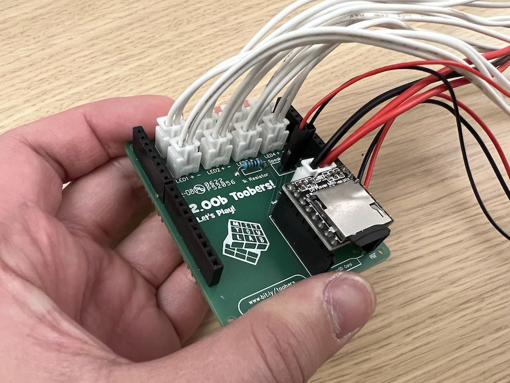 Woohoo! If you've done everything correctly, you should see your Toobers play the starting tones and the arcade button should light up! If not, no worries. Go through the connections to see if anything is off, and don't be afraid to ask for help.
