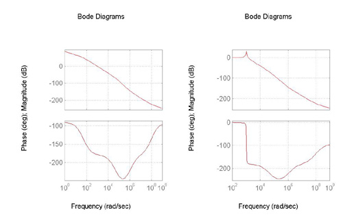 » Gsys=tf([1e-5 1e3 1e9],[2e-2 1e3 5e4 0]) Transfer function: 1e-005 s^2 + 1000 s + 1e009 ----------------------------- 0.02 s^3 + 1000 s^2 + 50000 s » Hsys=1 Hsys = 1 » Tsys=feedback(Gsys,Hsys) Transfer function: 1e-005 s^2 + 1000 s + 1e009 ------------------------------------- 0.02 s^3 + 1000 s^2 + 51000 s + 1e009 » subplot(121); bode(Gsys) » subplot(122); bode(Tsys) |