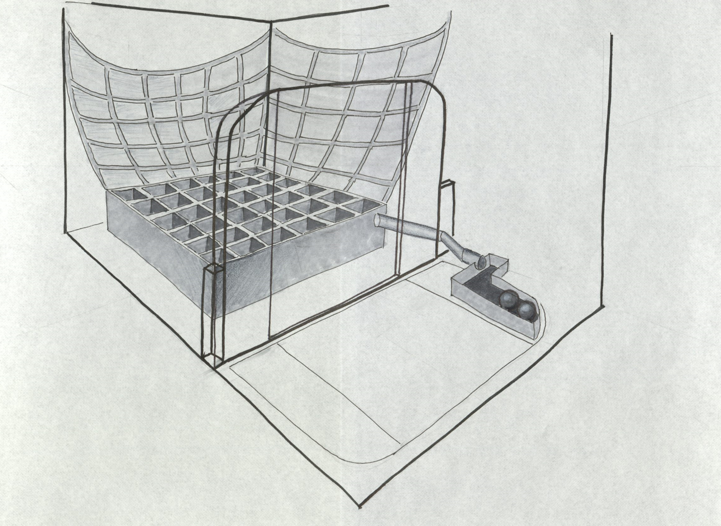 For this portion of the concept refinement we needed to think about the layout of the room, specifically how the ball catching leads to the ball feed that provides balls to the players. The display board, left outlined in the sketch above, separates the room into two parts where the players stand and the other side where the balls are thrown. We have reduced the board size from the original 10x10 grid to 6x6 to fit into the room proportions without having to make the ball pits too small. The ball pits will be around 1.5ft squares and the display board around 7ft tall. As the players will be throwing the balls blindly over the display board there is a very good chance they miss the ball catching mechanism all together so we plan on incorporating nets around the ball pits to catch the missed shots and lead them to the outside ball pits.