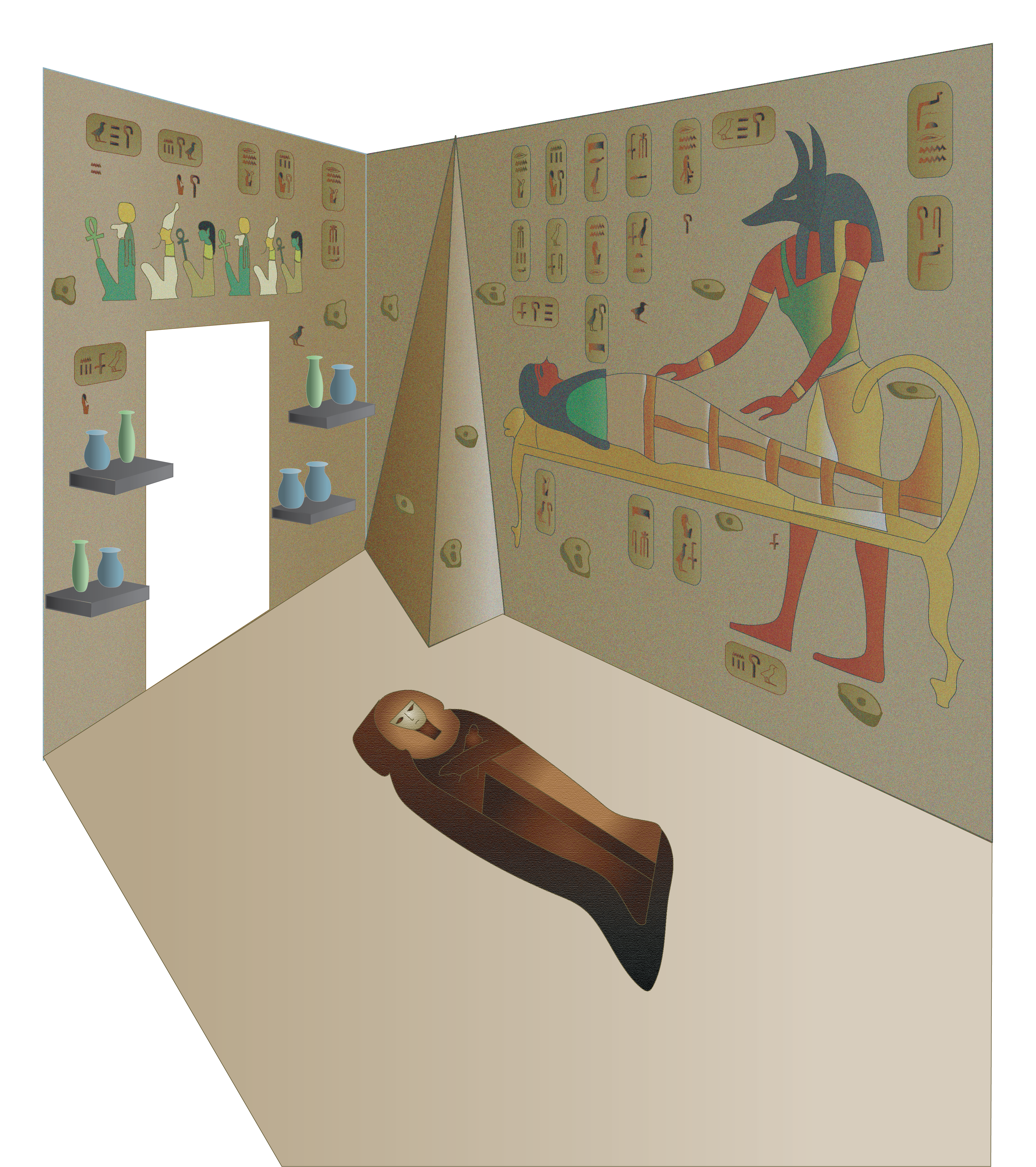 The players walk in and hear Egyptian music playing. They see the four sarcophagus walls flash hieroglyphics.