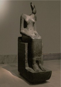 | Statues and paintings of Hatshepsut show her facial features and body form with feminine attributes, and later with masculine attributes. In earlier statuary, her femininity is highlighted by an oval face, the soft arch of her eyebrows and eyes, the presence of bosoms, shapely hips, and rounded shoulders. These womanly features disappear over time as she later becomes featured as a flat-chested male pharaoh. In her full male form, Hatshepsut's statues were painted a unique orange skin tone, a mix between the deep red pigment used for painting men and the lighter yellow pigment used for painting women. The interesting shift toward a more masculine portrayal of Hatshepsut is also shown through the type of clothing she is depicted wearing. |