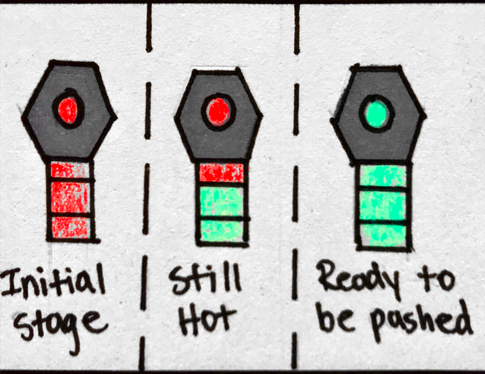 6. The players try to decide why they failed the game this time. They reason that if a fuel cell is red it might simulate that it is hot and shouldn't be pushed back in yet, they need to wait for it to cool. The players decide to wait to see what happens with the red fuel cells before pushing them in. |