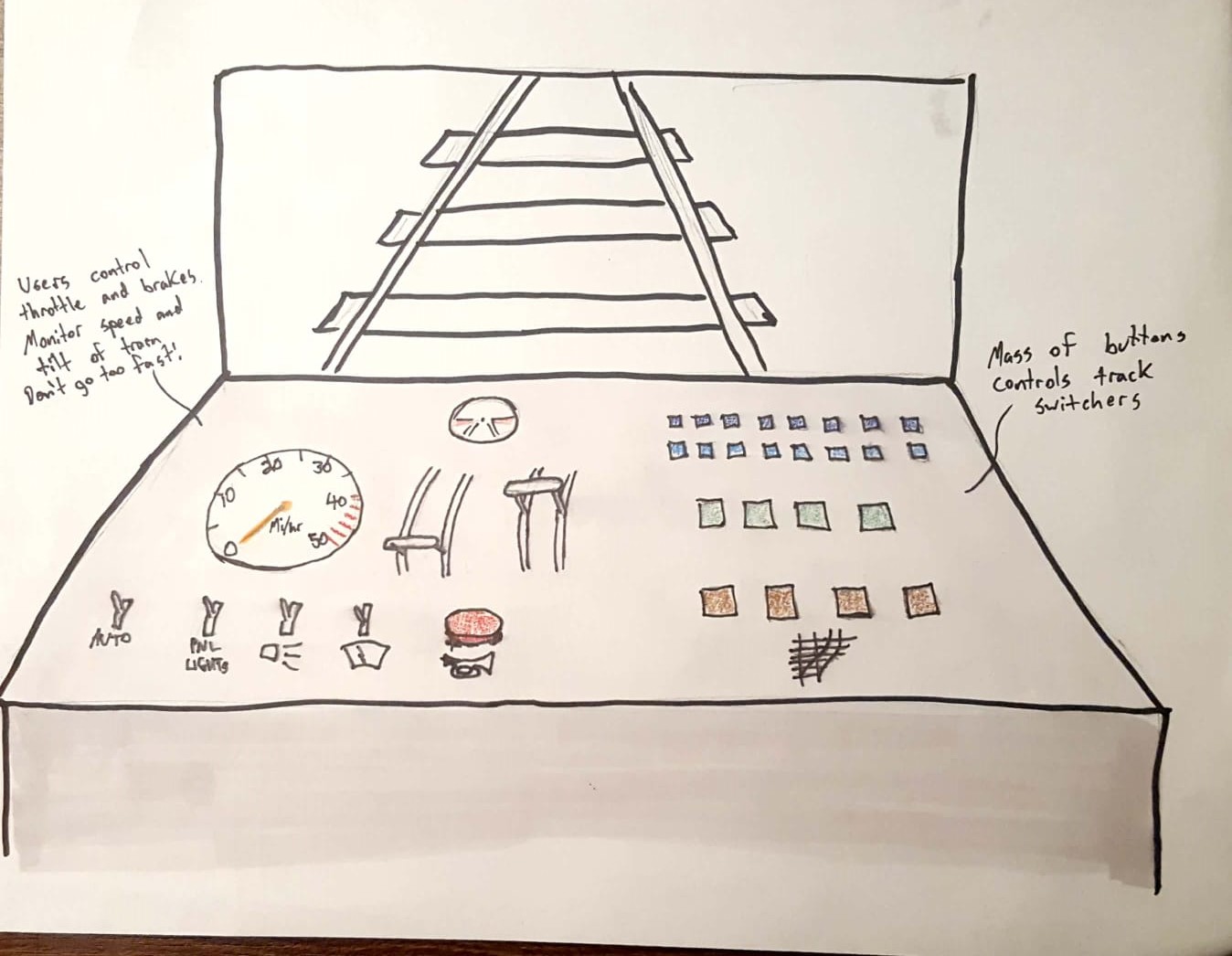 The train control panel is fitted with controls to drive the train on the left hand side and buttons to control the rail systems's track switches on the left hand side. Users will need to become experts on both sides to successfully flee to safety