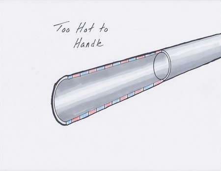 Here we create the illusion of a burning bar with the thermal grill illusion. Interior channels carry alternating hot and cold water. The contrast between the two creates a burning sensation despite being safe to the touch. Curious how it works? Check it out