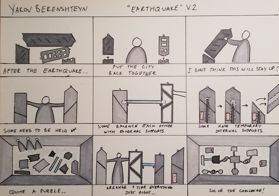 The team must work around 3 types of support structures: (1) No Support, (2) External Supports, and (3) Internal Supports. The puzzle is complex, but if the team only has a few players or is not physically capable of reaching between buildings, they can rely on their wits to set external supprots and time the internal supports.