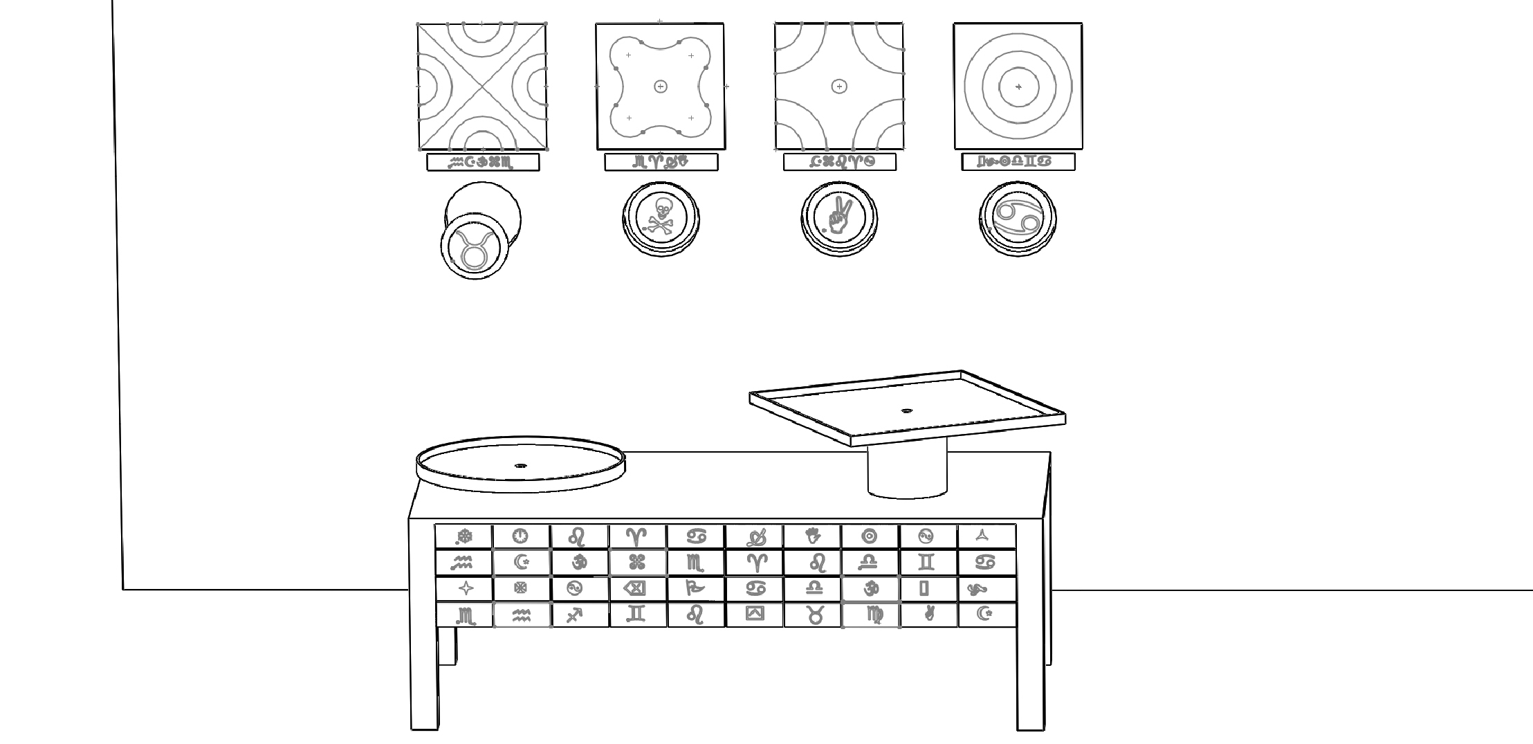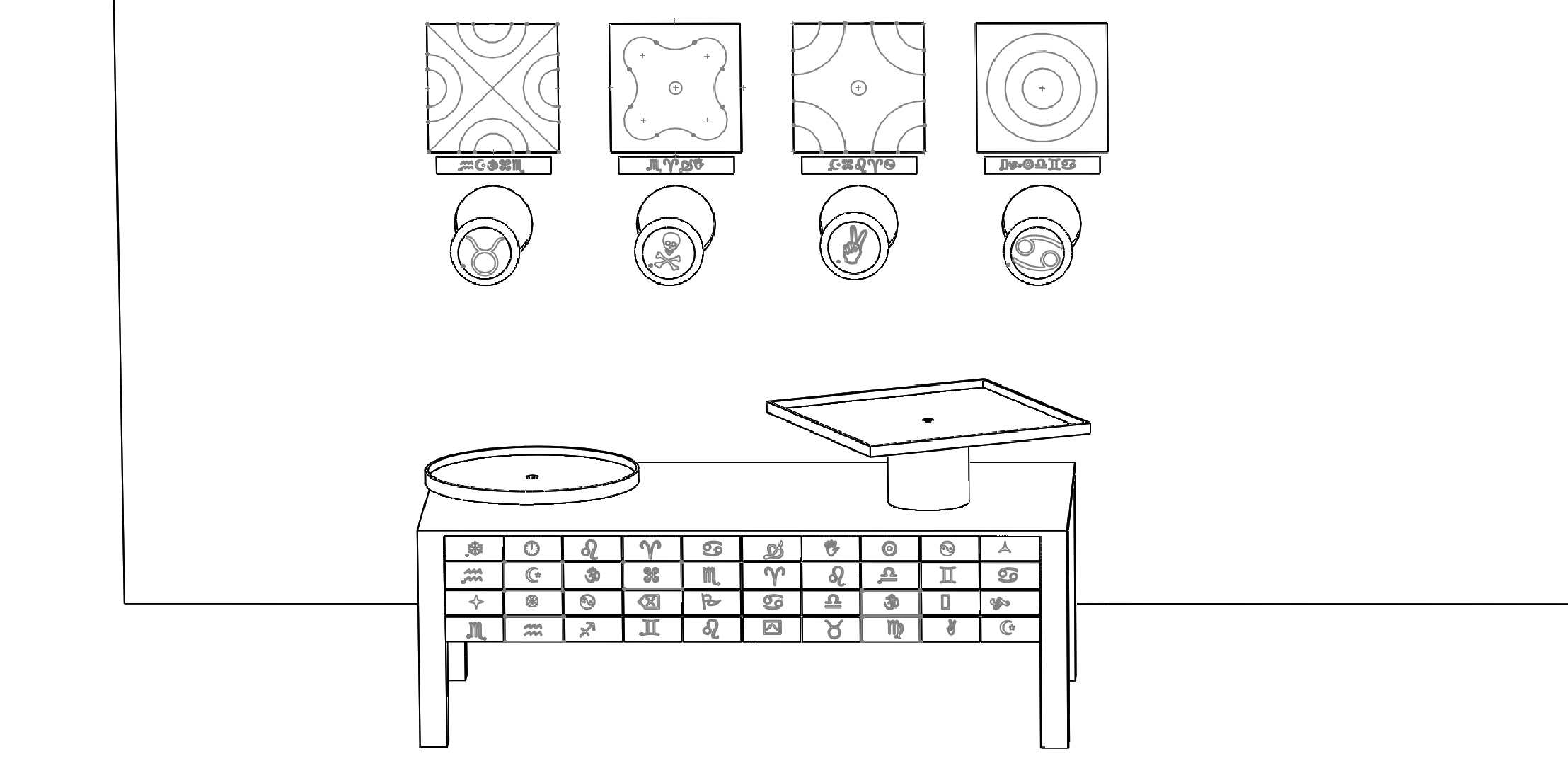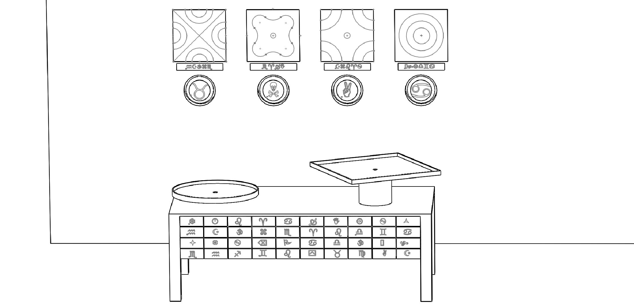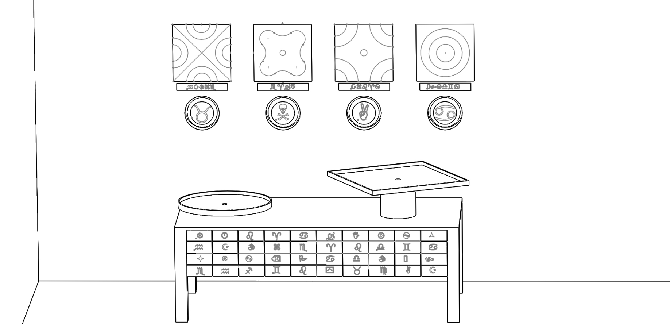 You go back to the table, and try to figure out how to unlock the medallions. You see that the sand in the plate that is on the raised platform is arranged in a pattern identical to one of the images on the wall (say the first image, but it can be any image). You examine the corresponding image and look more closely at the name of that image. You then see that you can find the characters contained in the name in the bricks on the facade of the table. You push on one of those bricks and it goes inward and lights up. Wow! Then you do the same for the remaining characters, until you spell out of the name of the first image. If you push on a brick not found in the name, it simply springs back at you. This part of the puzzle requires collaboration and coordination, where one person will be looking at the image name and telling to another person which bricks to push in. (It could even be made, such that all bricks corresponding to the name would have to be held pushed simultaneously, in which case the requirement for multiple people would become mandatory.)