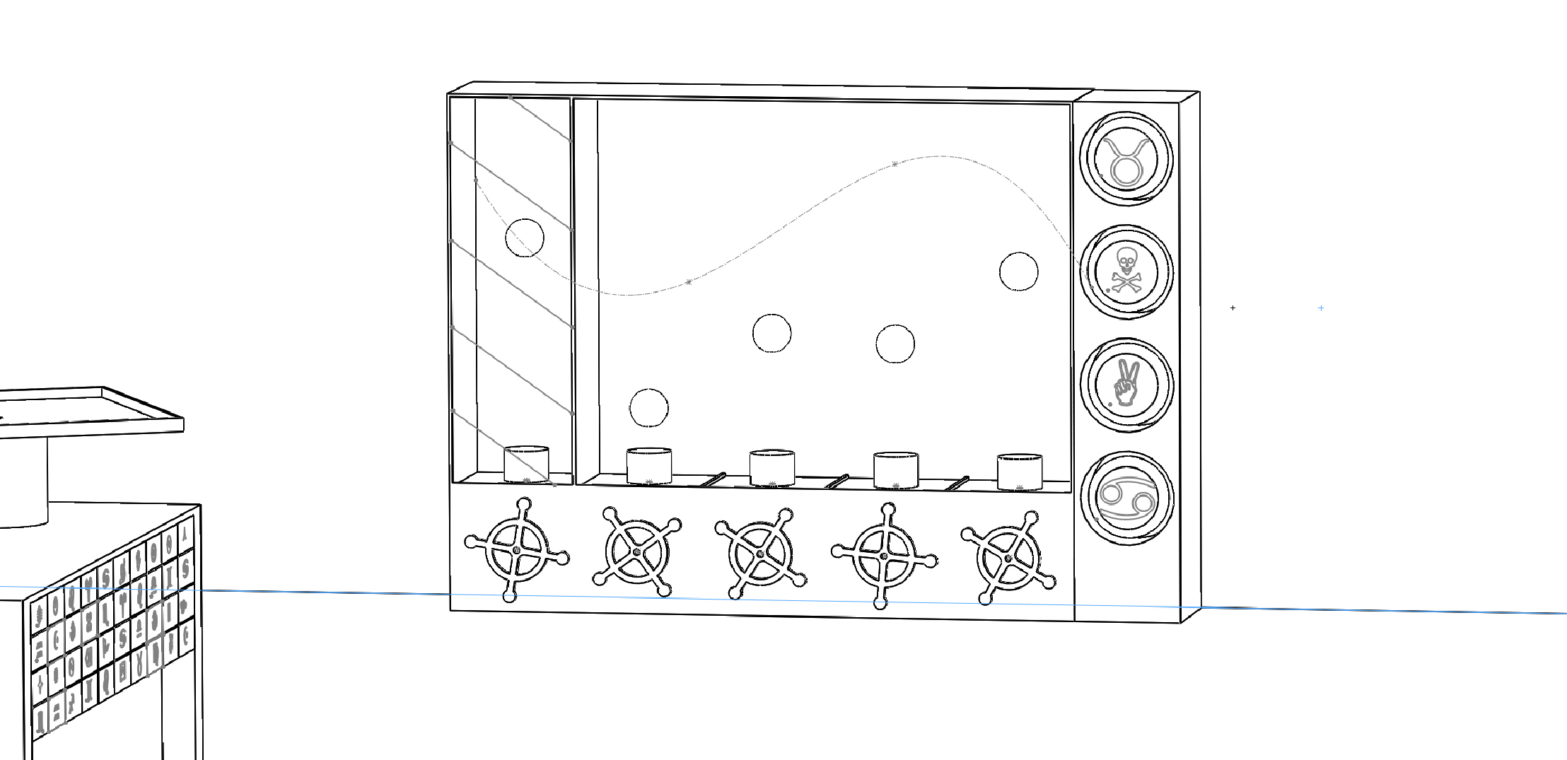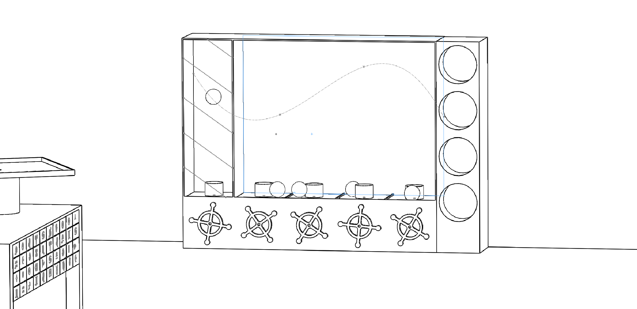 On another side of the room, there is an intriguing contraption that has 5 turning wheels at the bottom, 5 air-tubes above each wheel, and a ball for each air-tube. The leftmost side of the device is fully enclosed behind a transparent plate, inside of which a ball is levitating in mid-air enabled by the Coanda effect. To the right of it are 4 more balls that are not levitating, and no airflow is coming from the hoses. On the back of the device are some strange looking Egyptian drawings and hieroglyphs (not shown on the image). There is also a brightly-lit wavy line as shown. On the rightmost side of this device are 4 vertically-arranged cylindrical holes, equal in diameter to the holes that contained the medallions underneath the pictures on the other side of the room. You realize that you have to take the 4 medallions from under the images and place them here to start this machine.