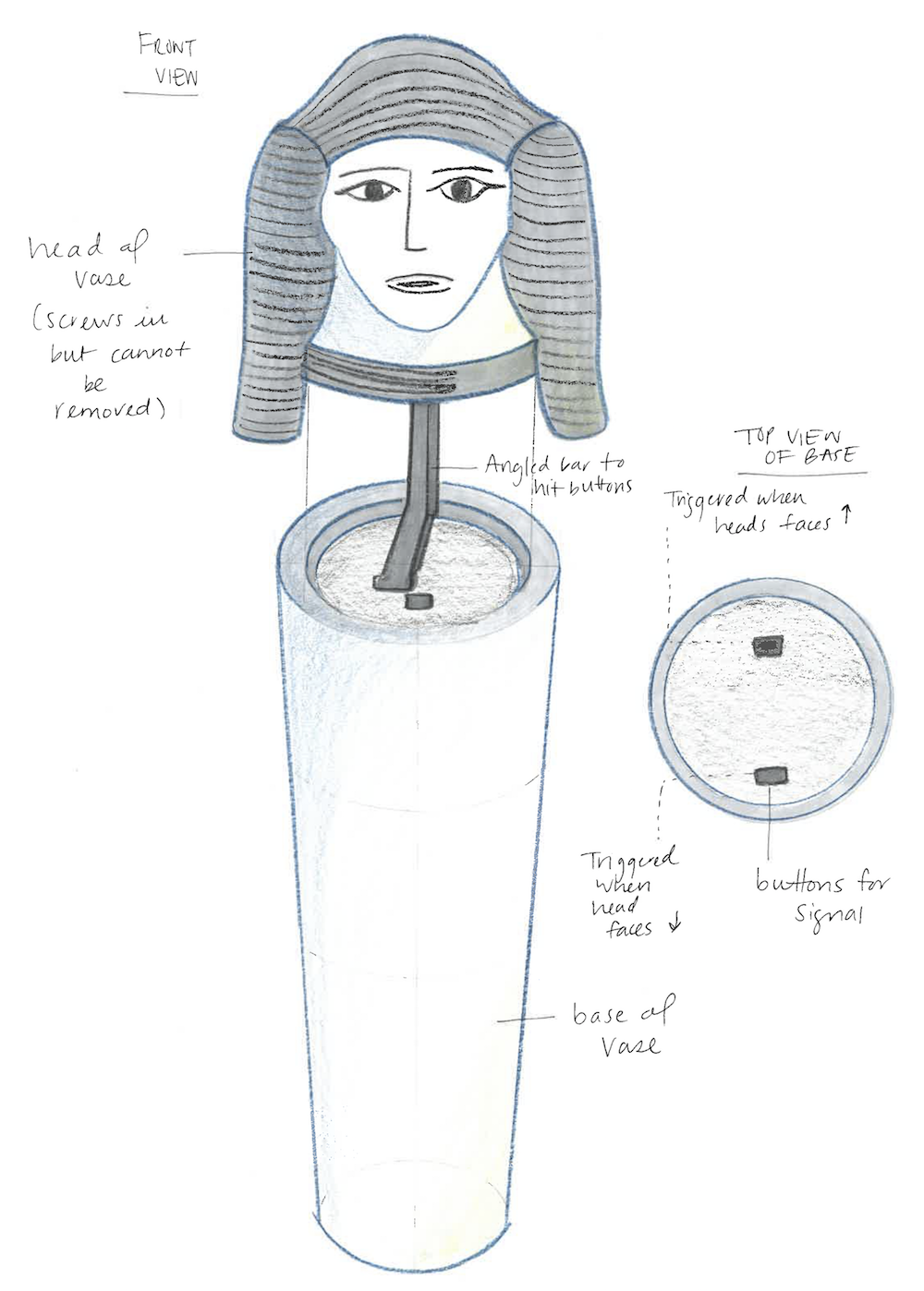 There will be two Sphinx Vases in the labrynth. Each will be composed of two parts, a head and a base. The head cannot be taken off, but will have indents on its cap to turn it only 180 degrees back and forth. There will a bar attached to the head, that when the head is turned to each 180 degree max angle it will hit a button/trigger that will be wired to the panel controlling the monkey bars.