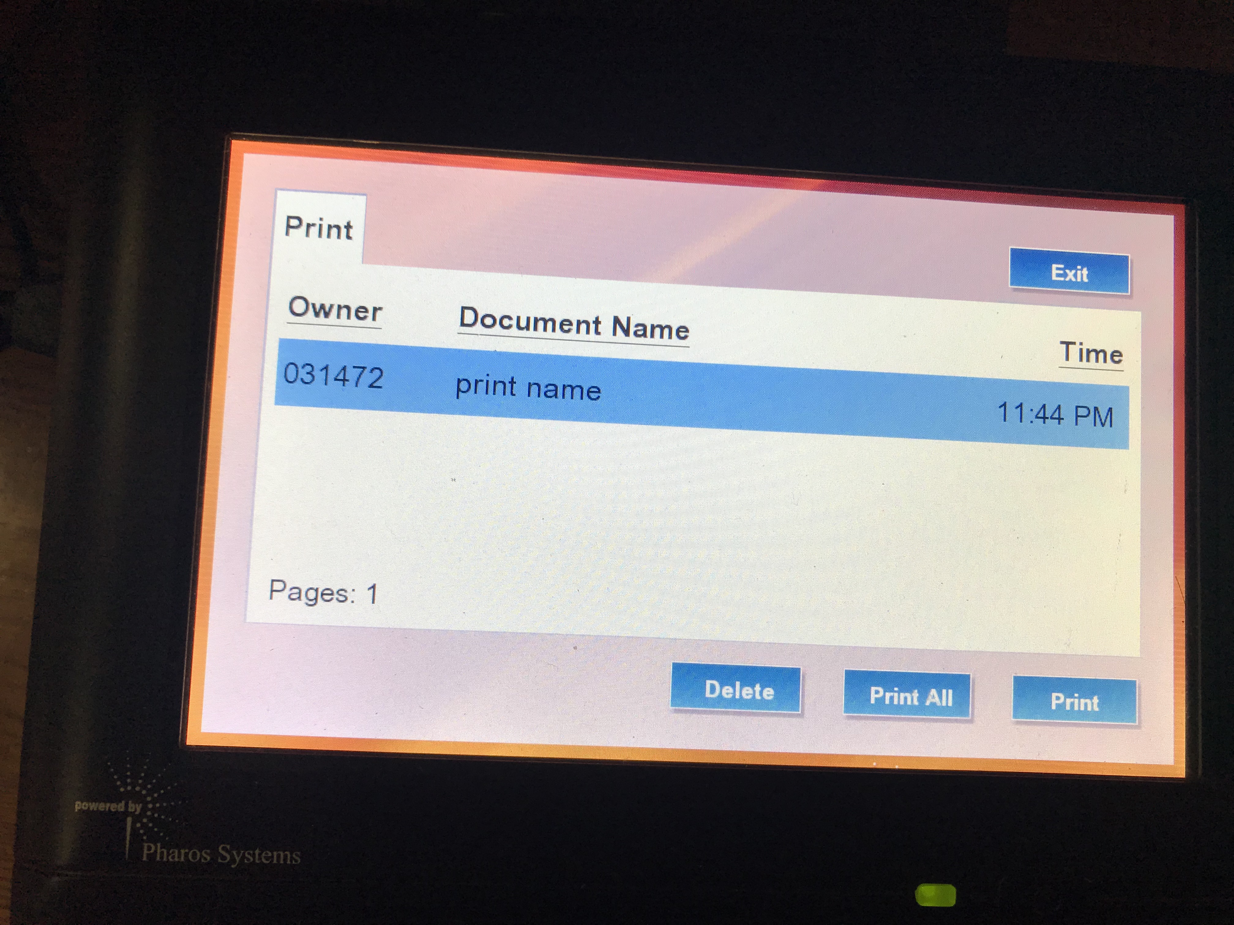 From the MIT Pharos website, Pharos is described as "a software package that provides "hold-and-release" printing. Normally, when you print a job, it is sent directly to the printer. Under a hold-and-release system, when you print a job, it goes into a queue where it is held until retrieved by you at a "release station"." Anyone who has an MIT Kerberos account is able to print to these printers, either through an Athena computer or their own computer using downloaded software. There is, however, no solution to printing from mobile devices.*