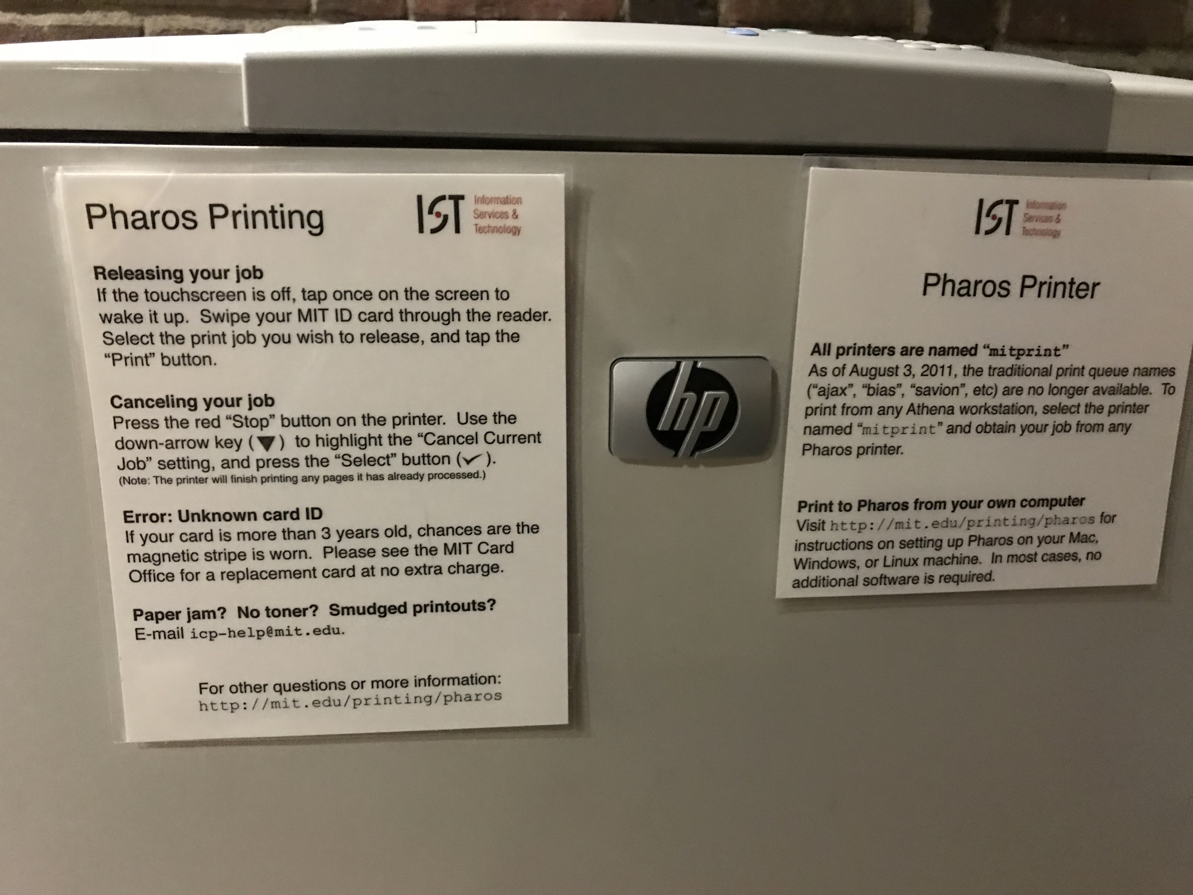 MIT students are always hard at work doing pset after pset, studying for tests, reading for a HASS, or writing long essays. Often times these same students find that they need to use a printer. This could be to print their homework, essays, readings, or maybe a practice test. Either way, many MIT students will sometimes print up to 50 pages when they end up using the printer. Conveniently, MIT students are able to print wirelessly to any on-campus printer that uses a system called Pharos. These printers are available throughout MIT, at many useful and handy locations, including in the infinite hallway, Stratton student center, and in resident halls.