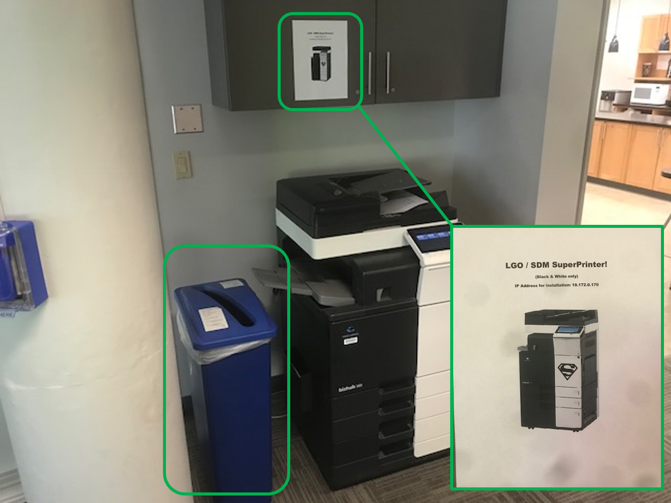 The location of the printer is somewhat awkward; the user must back up and walk around a large concrete post to retreive printed document; the printer coult be easily shifted to the right and the recycling bin could be placed on the machine's left side (note: I did this)