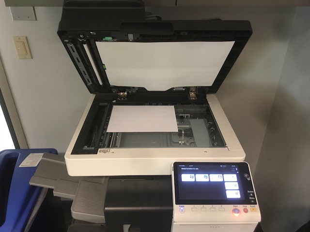 1. The user initially opens the top of the multifunction printer where the one-sided scanner is located. The portion of the printer which has been raised remains raised after being lifted, allowing the user to easily situate the page to be copied.