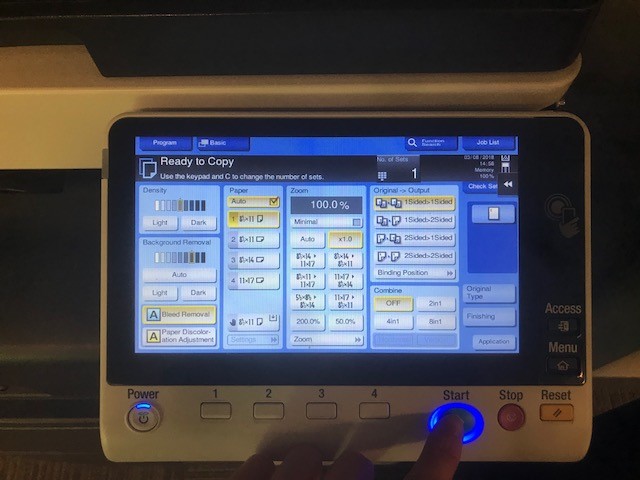 3. The user enters the copying portion of the touch screen menu. The largest button on the control interface of the printer lights up, suggesting that this is the button that the user must press in order to make the copy.