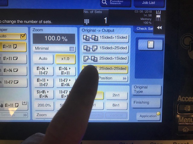 4. The user selects a button labeled "two-sided" within the scanning control window and presses the primary button on the control interface.