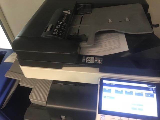5. The printer immediately feeds the document which is to be copied and prints a two-sided copy which is output in the same location as the printed document. The original document is returned in a tray immediately below the feed tray.