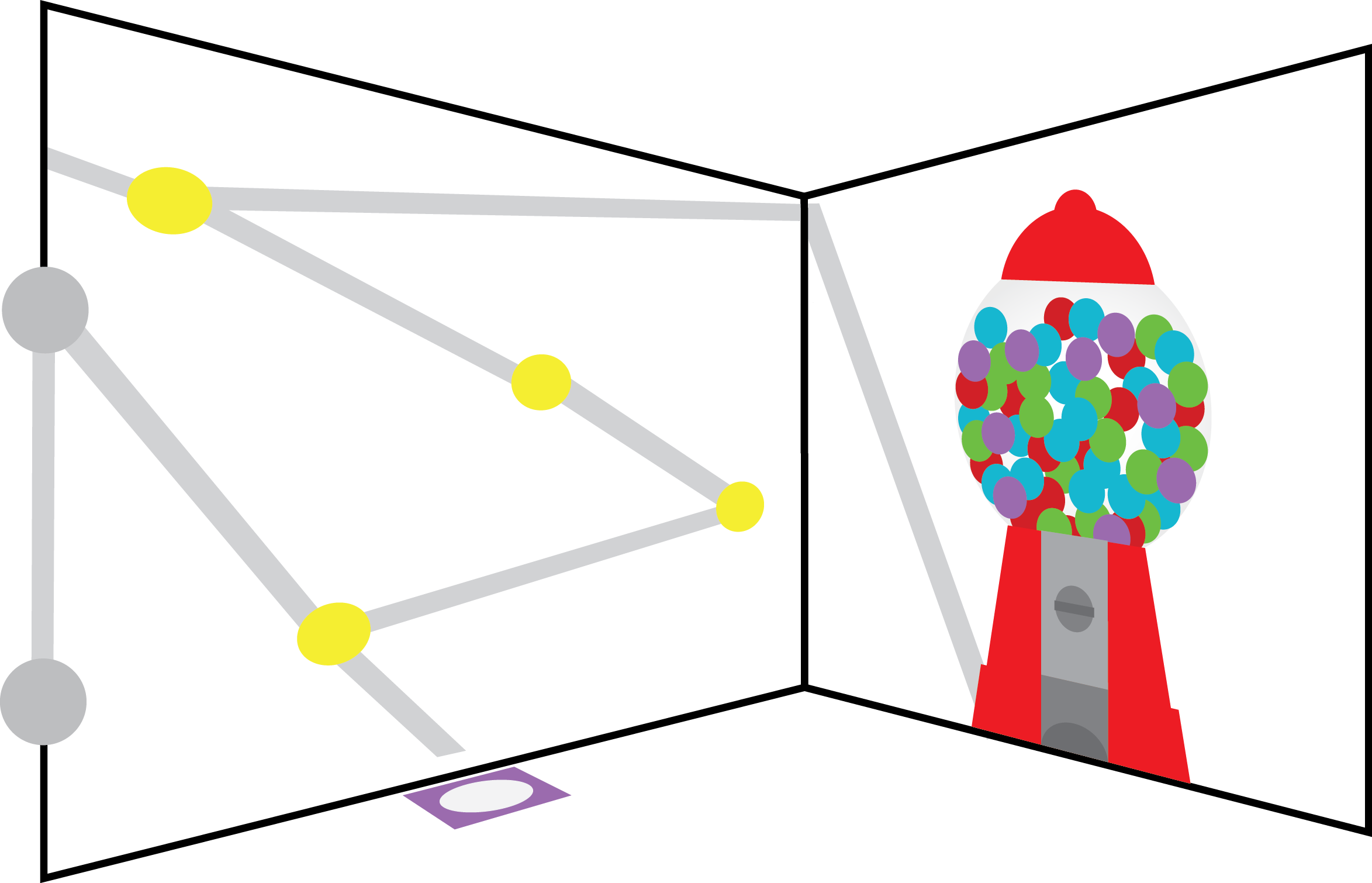 When guests enter the room, they will see a large gumball machine on their right. On the two other walls, there is a complicated system of tracks, with four colored holes on the floor. This looks like model is principally concerned with exploring the layout of the room and determining the track pattern on the walls.