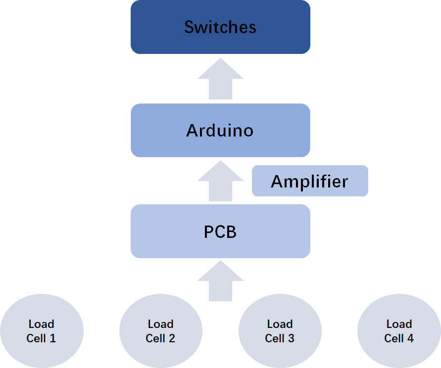 A simulated internal structure of the circuit assembly is shown below. As the load cell receives load from the player, related voltage signals are sent to the PCB board, amplified and then sent to the Arduino so that the Arduino could operate switches.