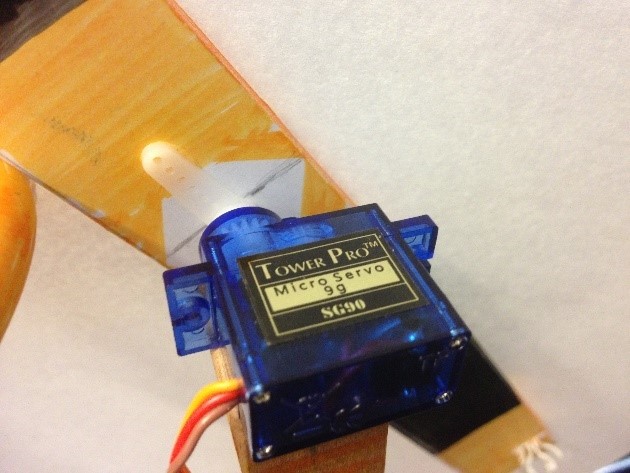 Originally, I thought I would need a stepper motor. But then I learned that a servo motor would be better suited for my application as it can control angular position, has a high efficiency, doesn’t vibrate, or experience resonance issues. Plus, the servo motor I found was lighter in weight and was more easily attached to the wooden frame.
