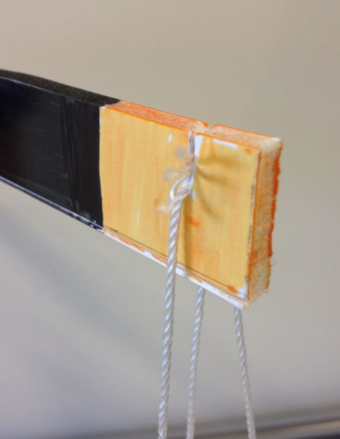 Initially, I had 2 strings holding the plates on the scale since that it what is depicted in ancient Egyptian wall paintings. Then I realized I needed 3 strings for the plates, otherwise the plates would become unbalanced and rotate. I forgot that the wall paintings were in 2d yet I am building in 3d. I was also able to secure the string into the foam core by creating a slit with an X-acto knife, instead of cutting a circular hole like I was originally planning.