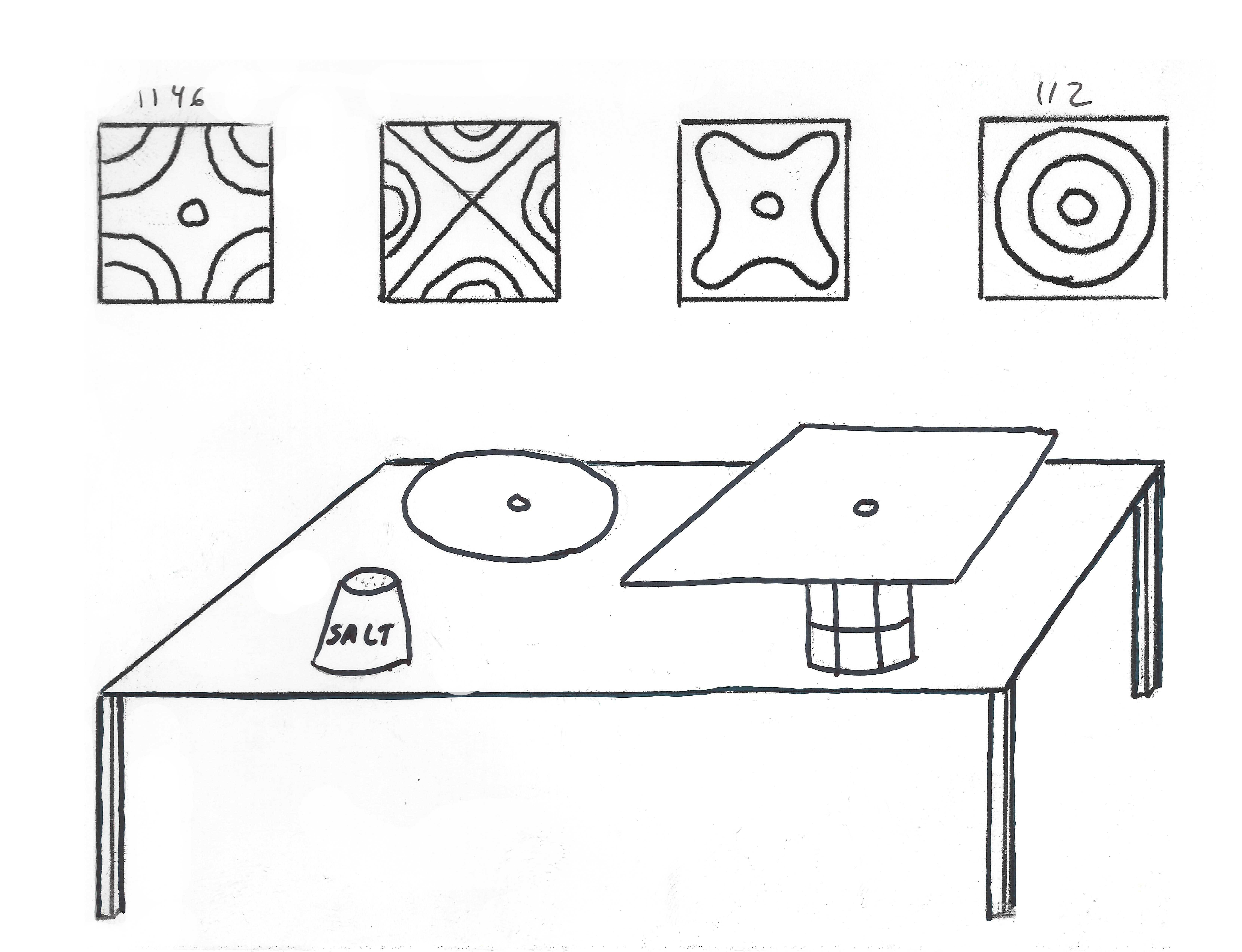 Imagine you enter The Magic Room, and all you see in it is a table, on top of which there are only three items: a square flat plate raised on top of a platform, a circular disk of similar area to the side, and a saltshaker. Behind the table there is a wall with four very strange images. The first image is labeled "1146", the last "112" and the two in the middle have no labels. You also see salt particles all over the table but no salt on the plate. Nothing seems to be making sense.