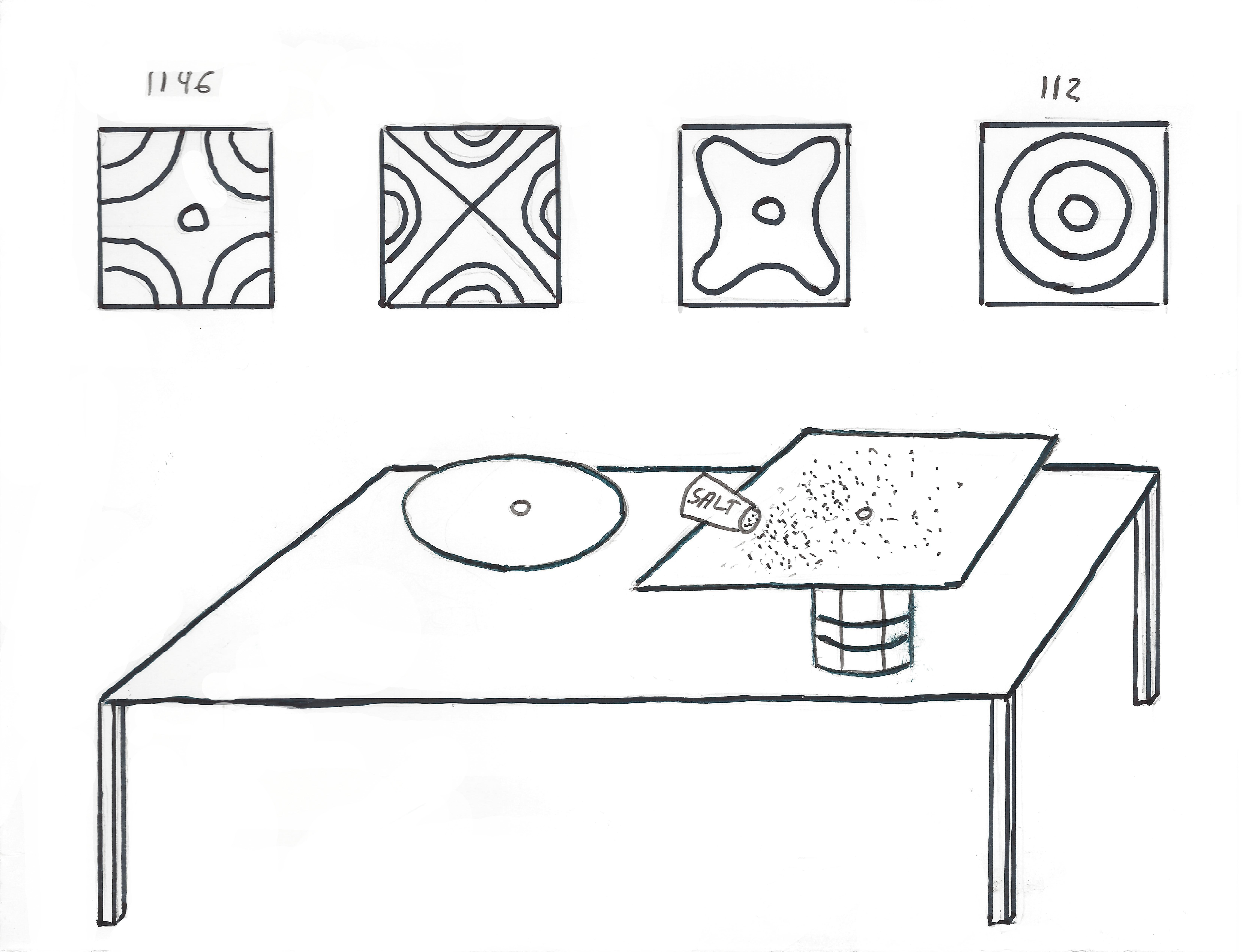 A few moments later, the first image on the wall lights up and you see that the pattern on the image matches the one into which the salt has arranged itself.
