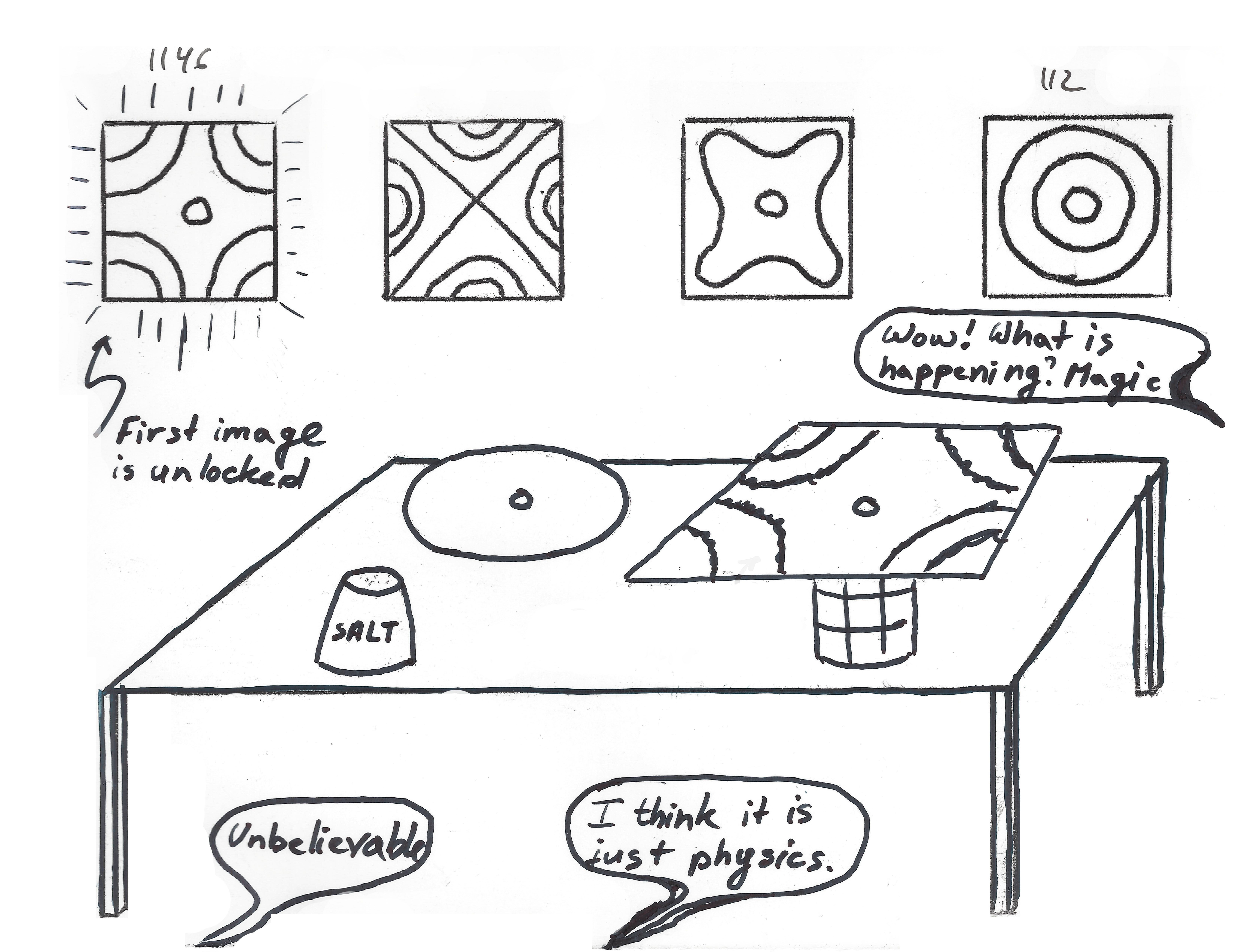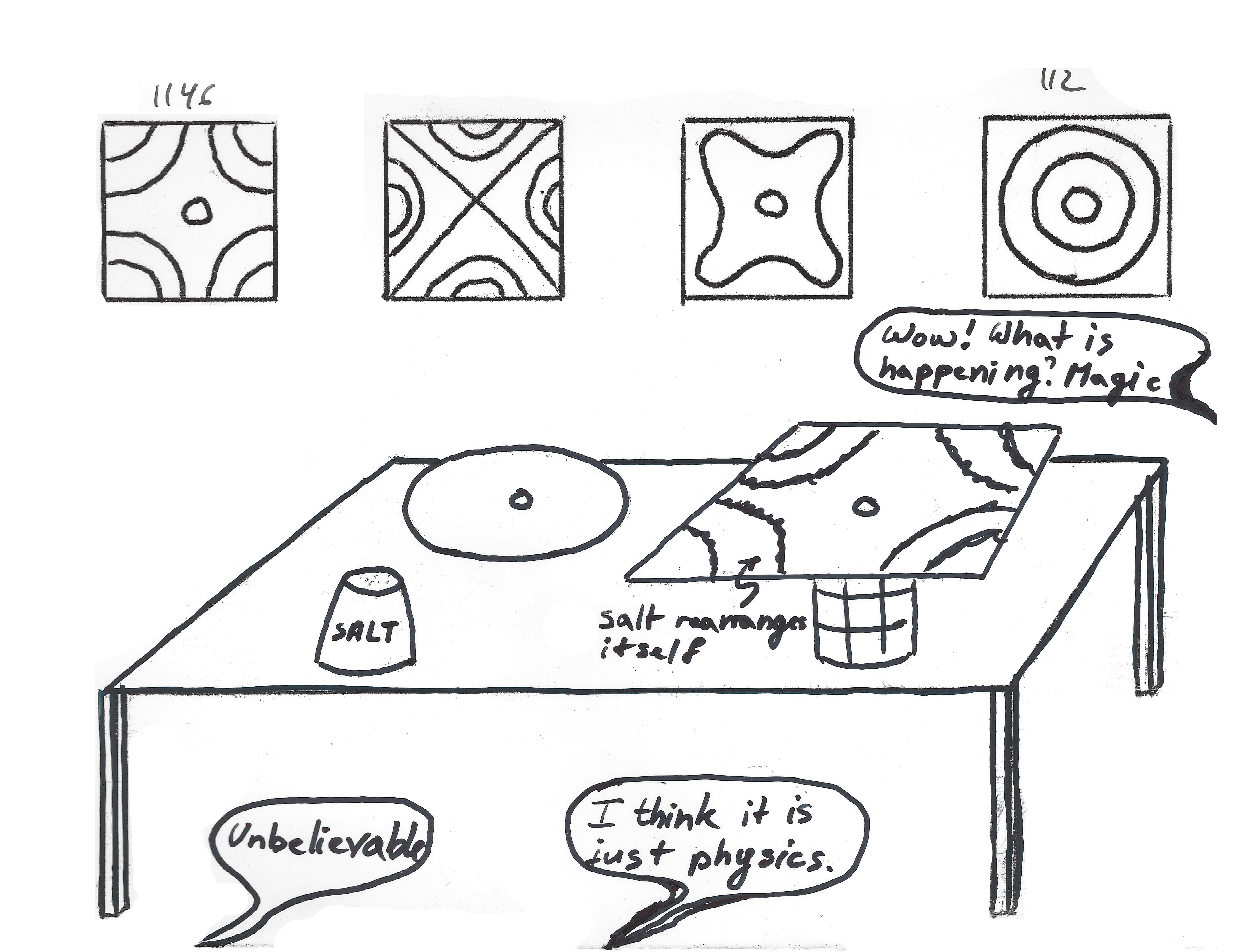 All of the sudden, you see something very incredible happening. The salt just magically rearranges itself into very specific locations on the plate. You cannot believe your eyes! Everyone in the room with you is mindblown. But your physicist friend is doubtful that there must be a natural cause to the phenomenon.