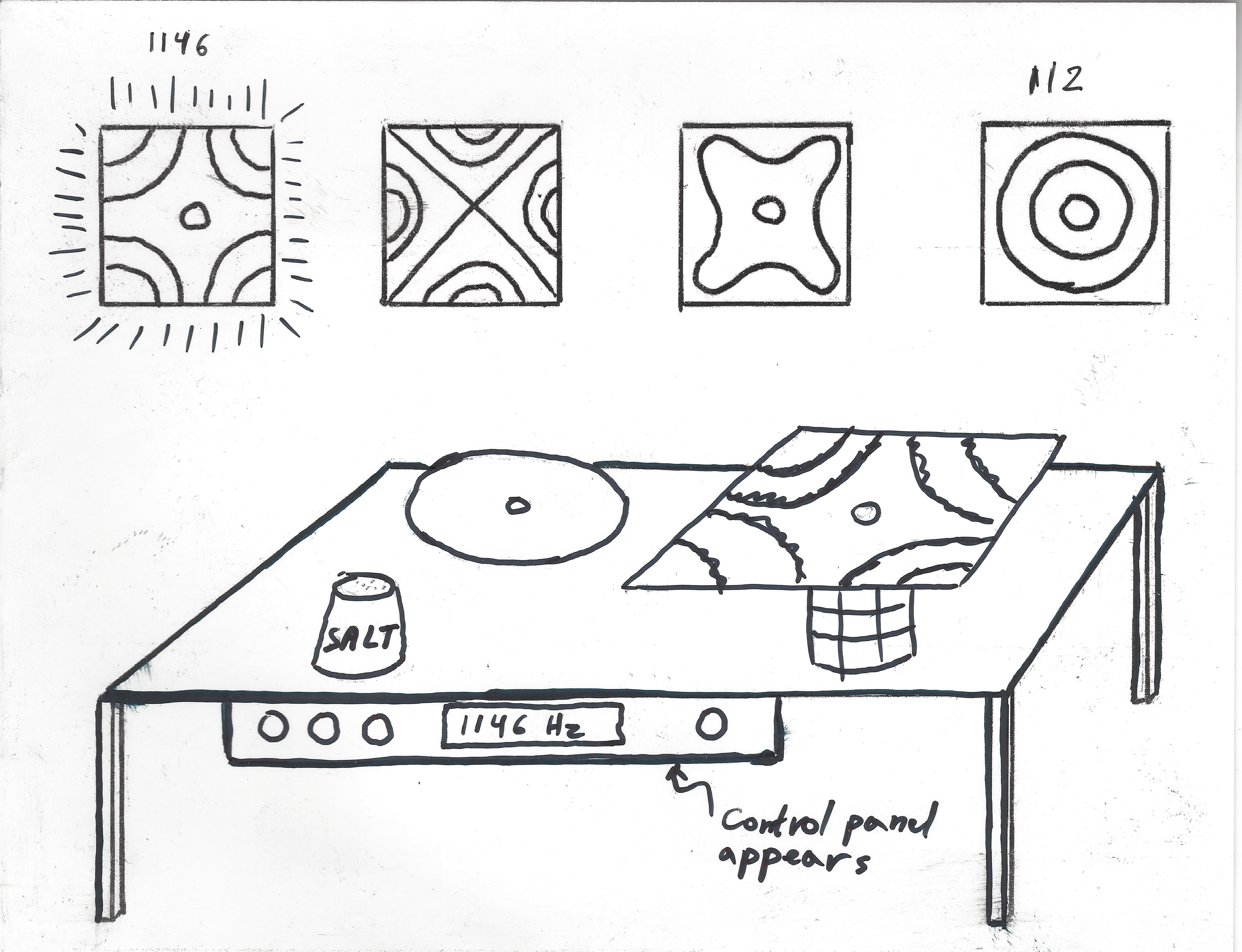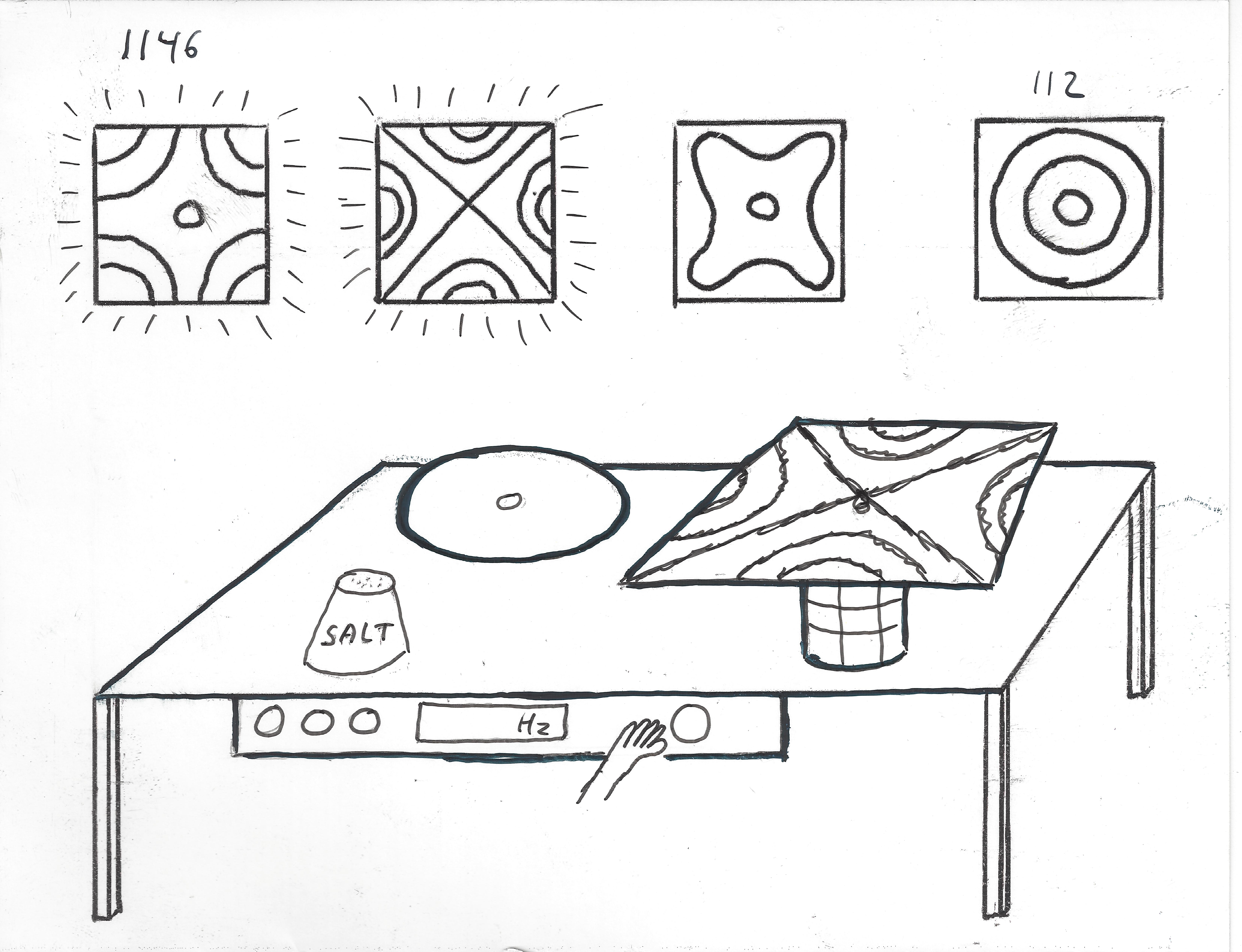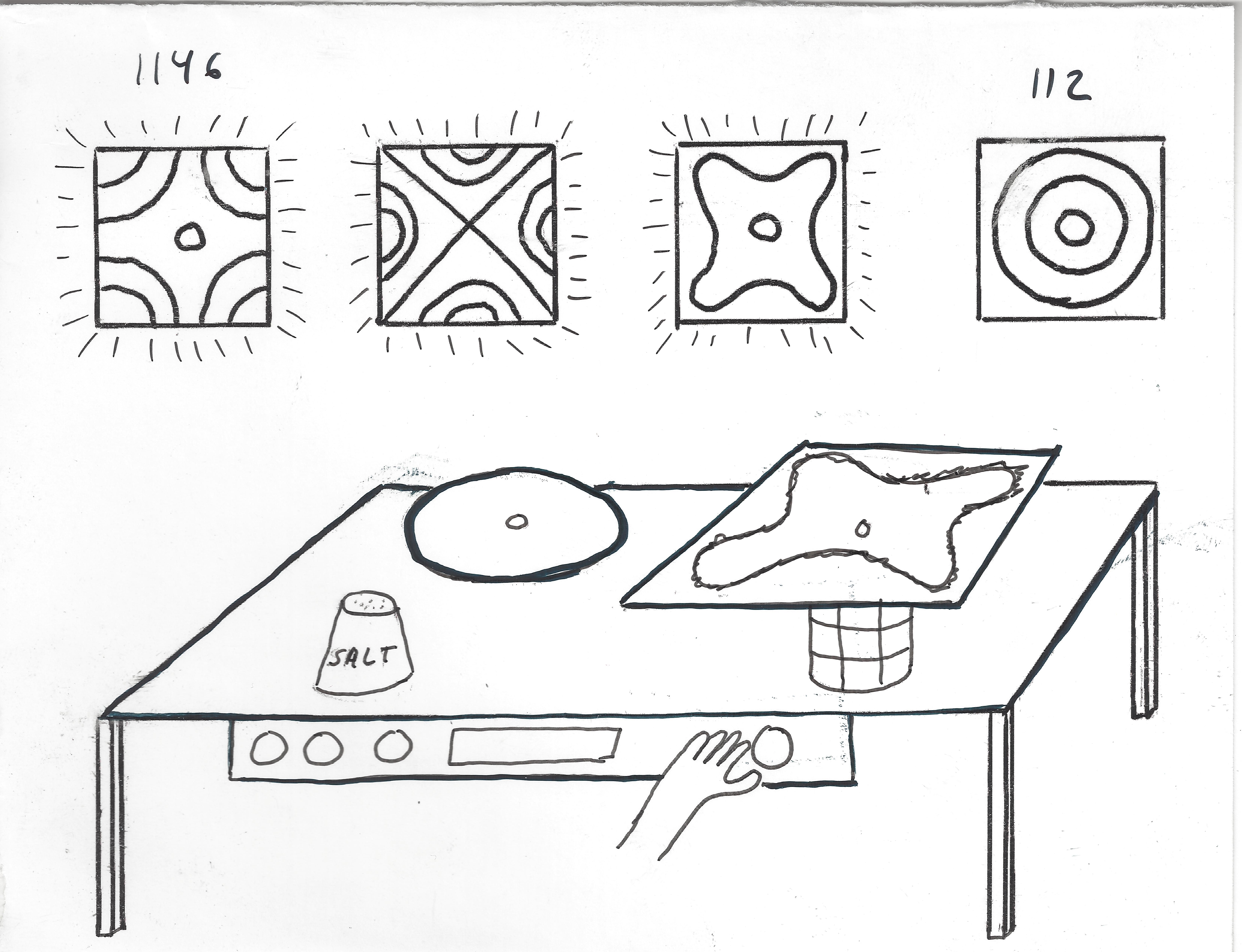 All of the sudden, a control panel appers underneath the table, and the screen on it reads 1146Hz. You recall that the title of the leftmost image is also 1146, and you you realize that these images on the wall correspond to different excitation frequencies. You realize that in order to unlock the remaining three images, you have to simply have to make the salt rearrange itself in the patterns shown in those images - by chaning the frequency. But the second and the third images have no numerical information associated with them. You seek help from you friends and while one of you is adjusting the frequencies, another one is watching the behavior of the salt.