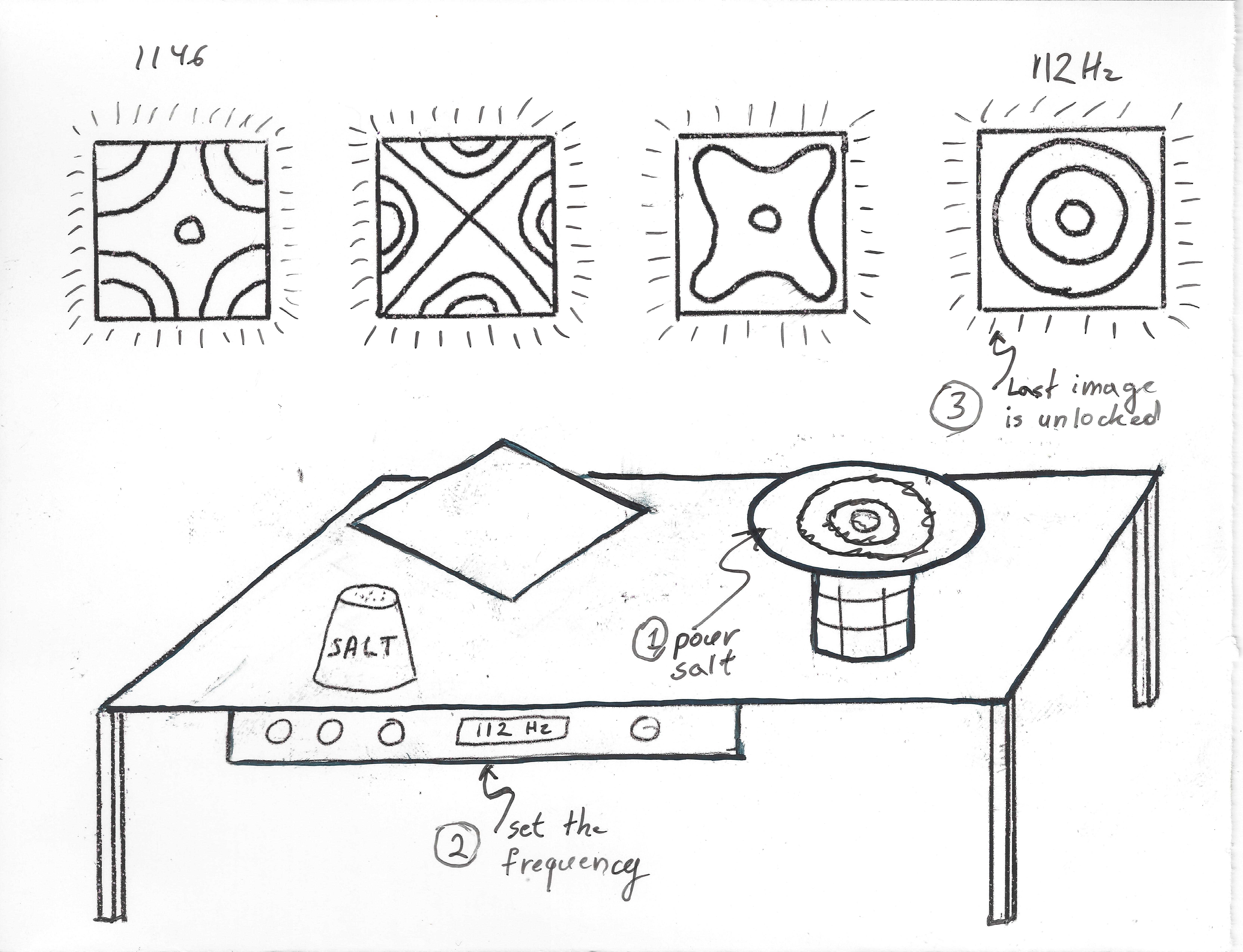 You sprinkle some salt onto the circular plate, set the frequency to "112", and you see the salt forming the three rings. Finally, you unlock the last image.