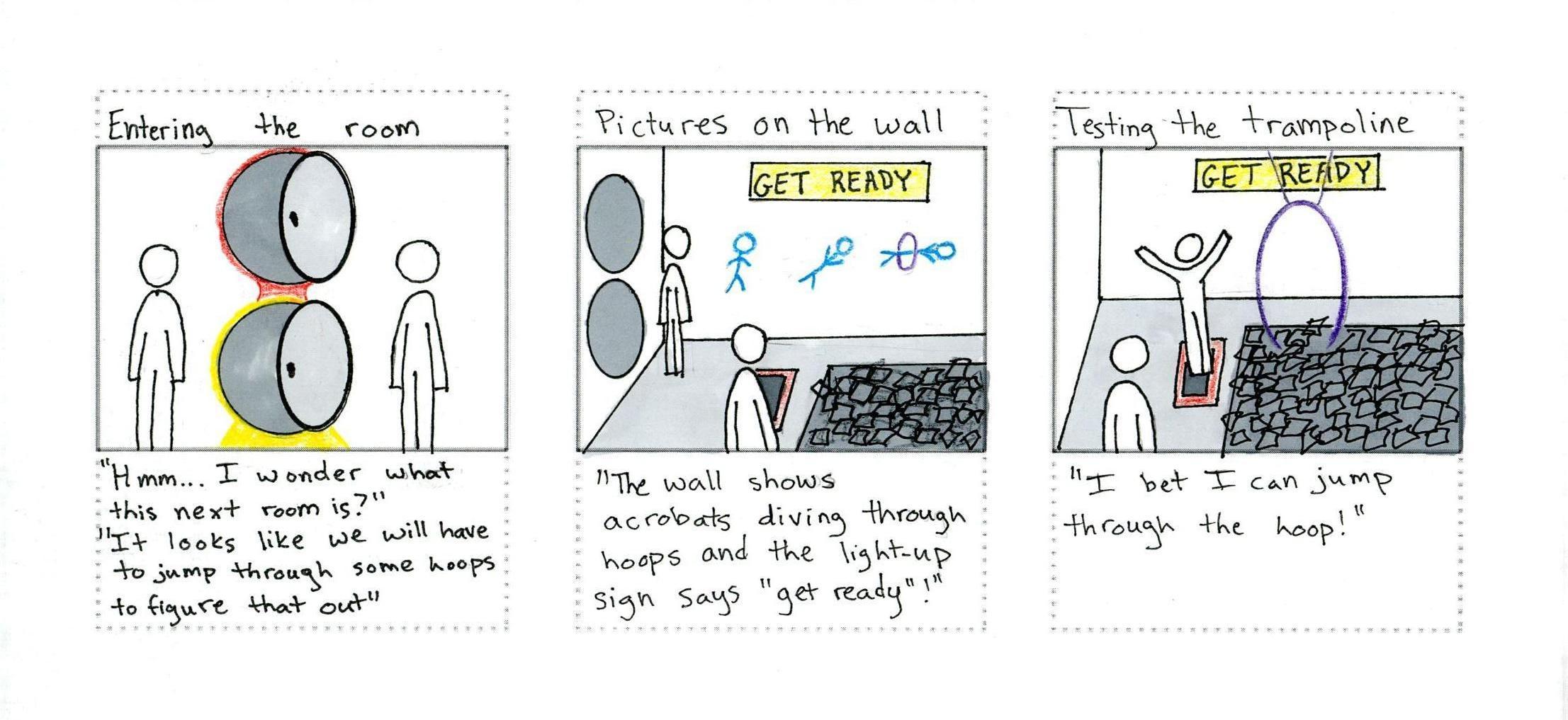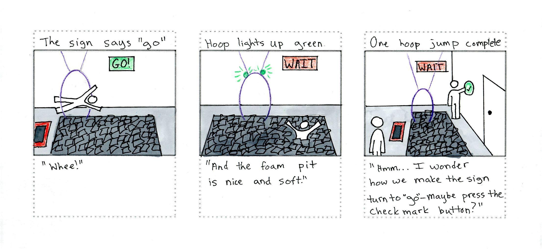 I think this room has the potential to be really exciting and a big draw, however it also has the possibility to be a safety concern. The room will be much safer if we can try to ensure that people won't jump and land on each other in the foam pit. To push groups away from having more than one person in the foam pit at once, I added in the "get ready", "go", and "wait" signs which will only encourage another person to jump once the past jumper has hit the checkmark, inidcating they are out of the foam pit.